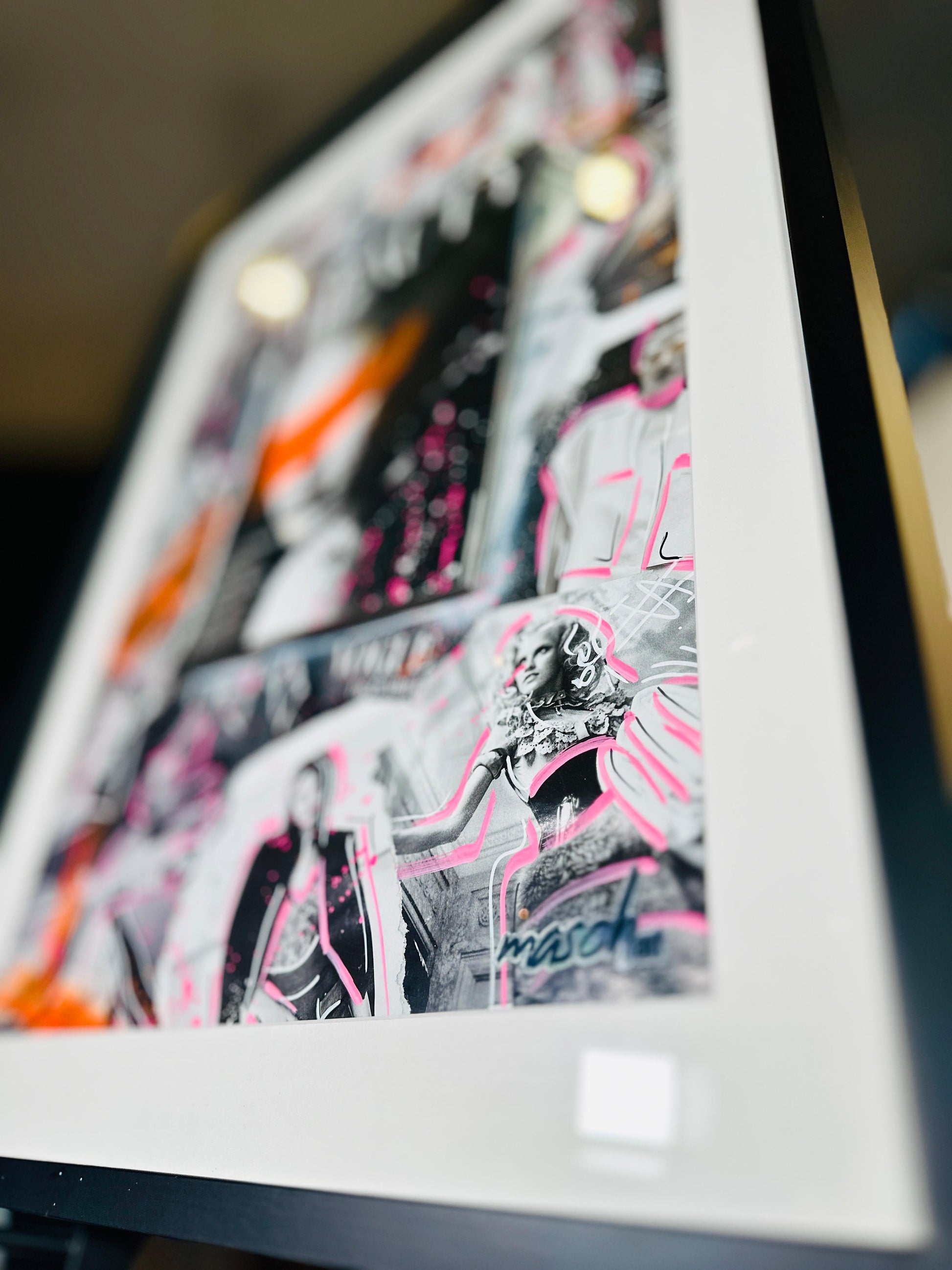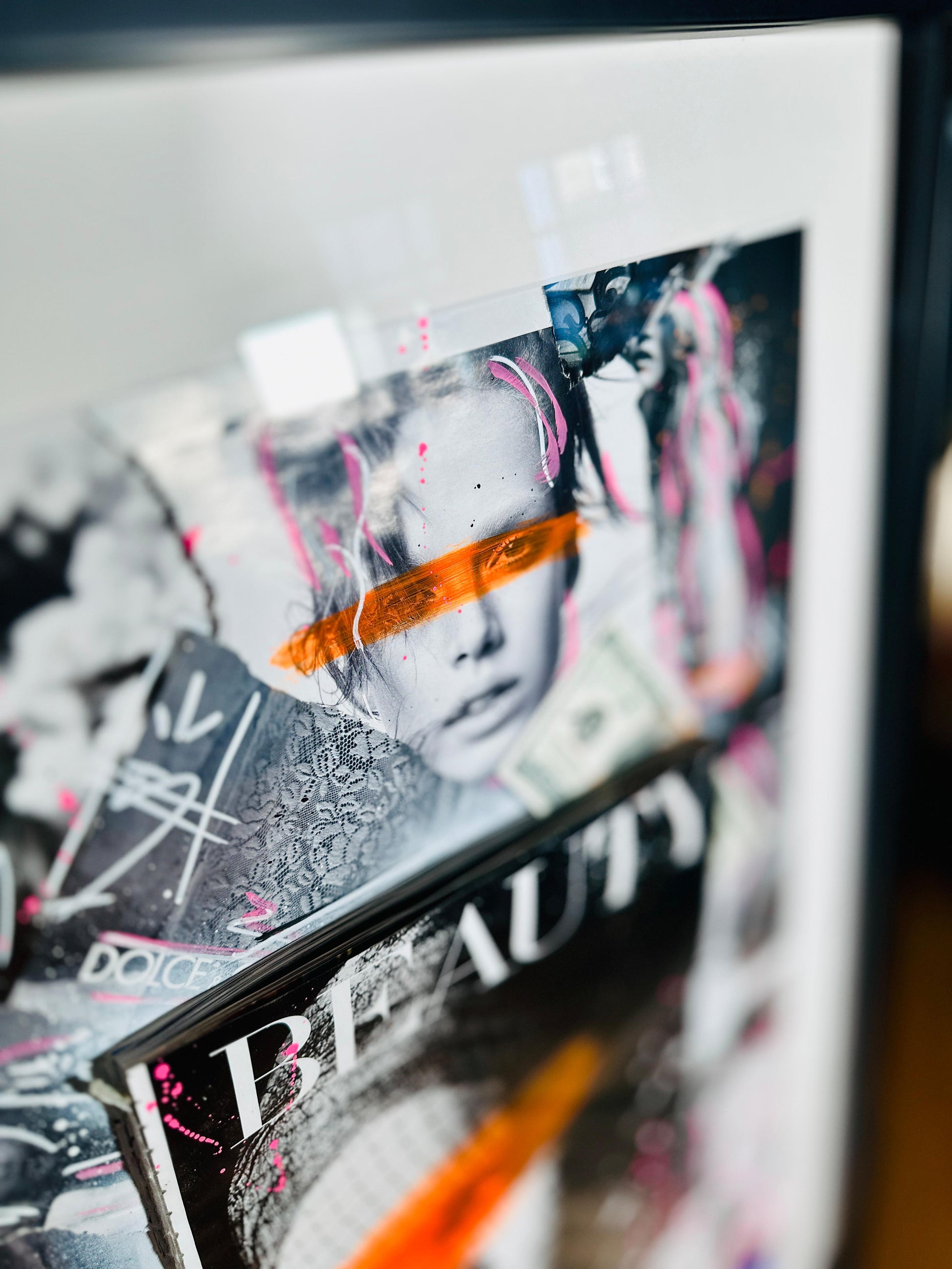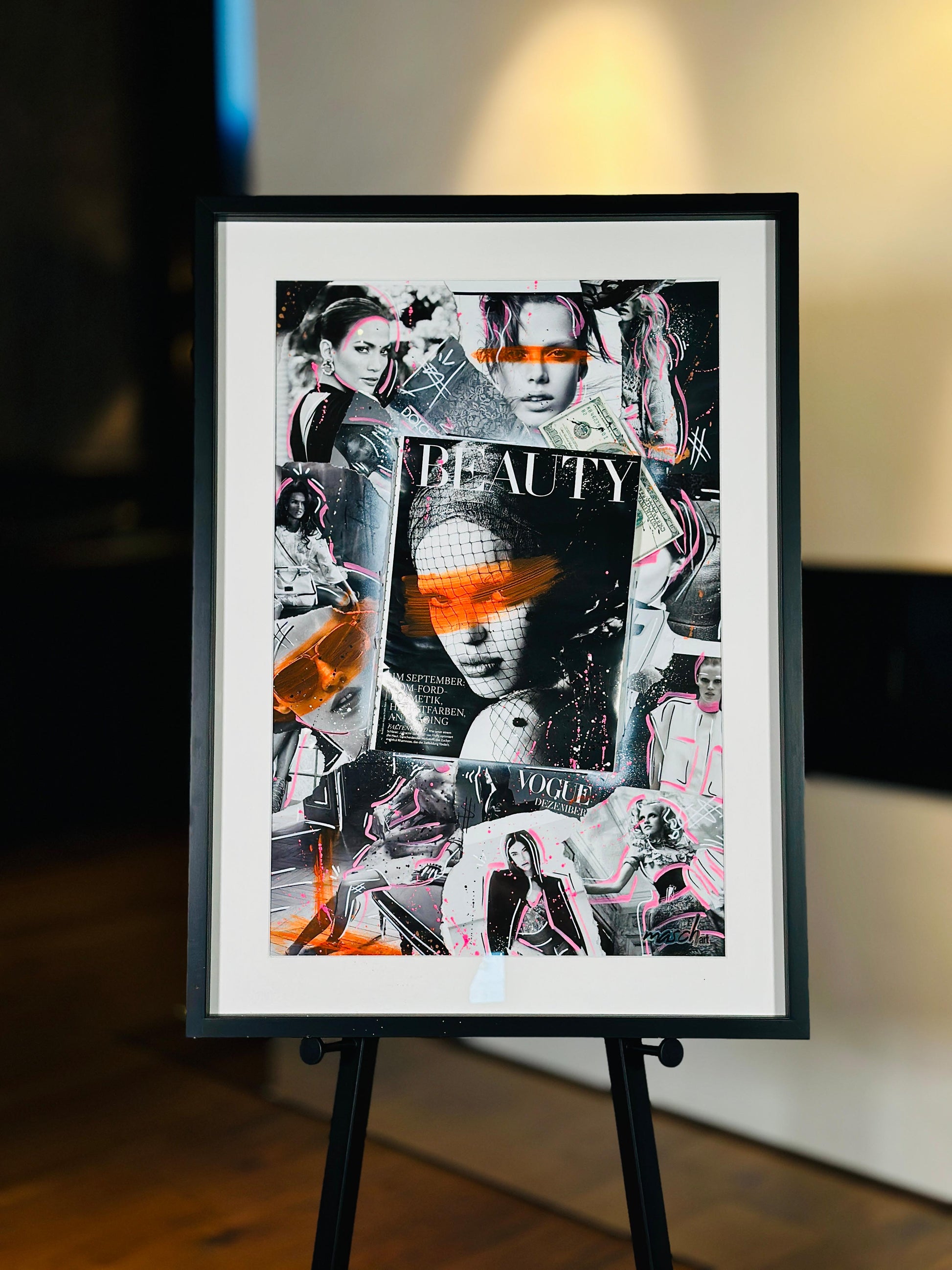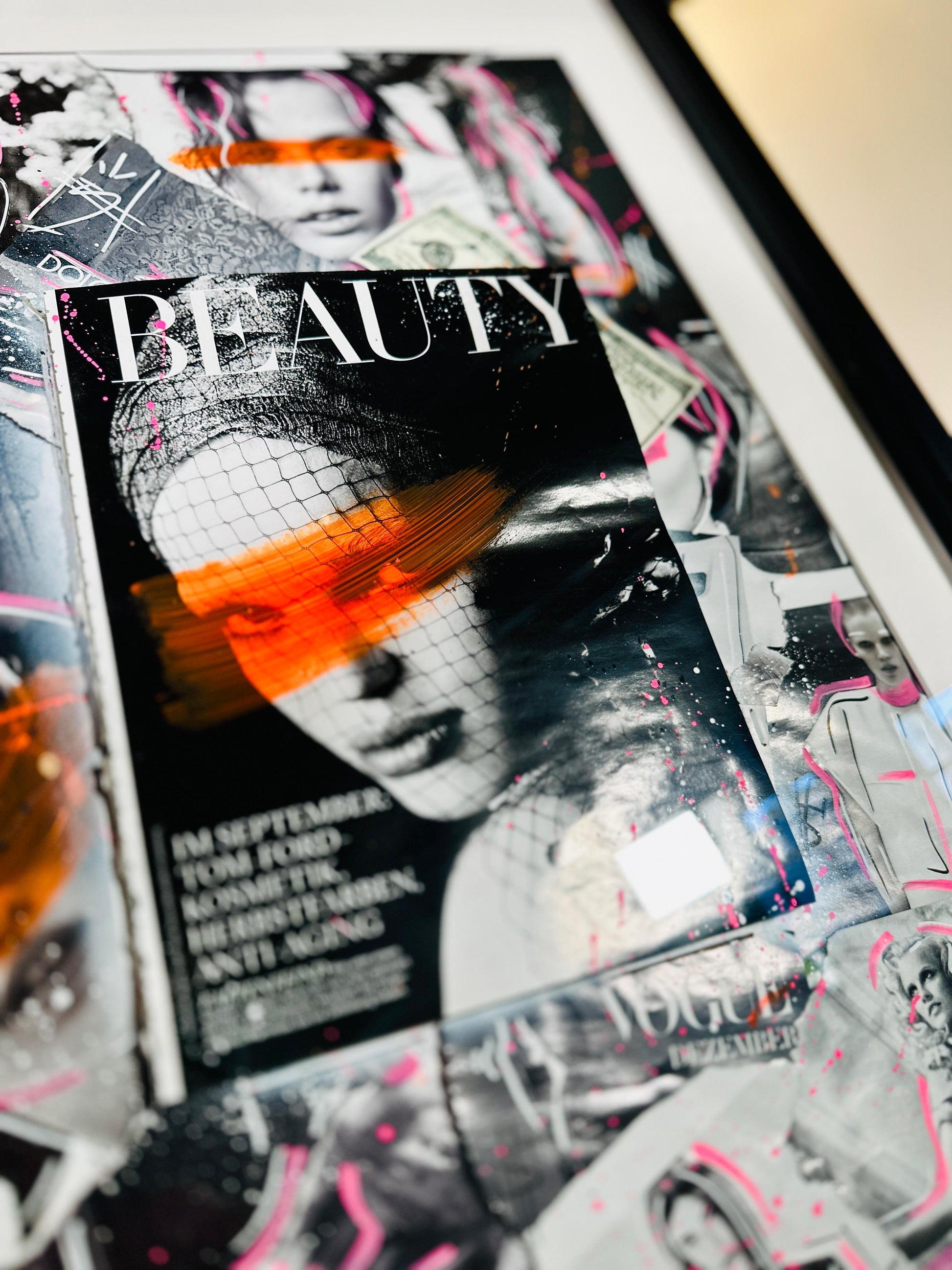 Collage aus Modeikonen, Magazinen und Geld – übermalt mit Neonakzenten. Ein Statement über Schönheitsideale, Glamour und die Illusion von Perfektion.