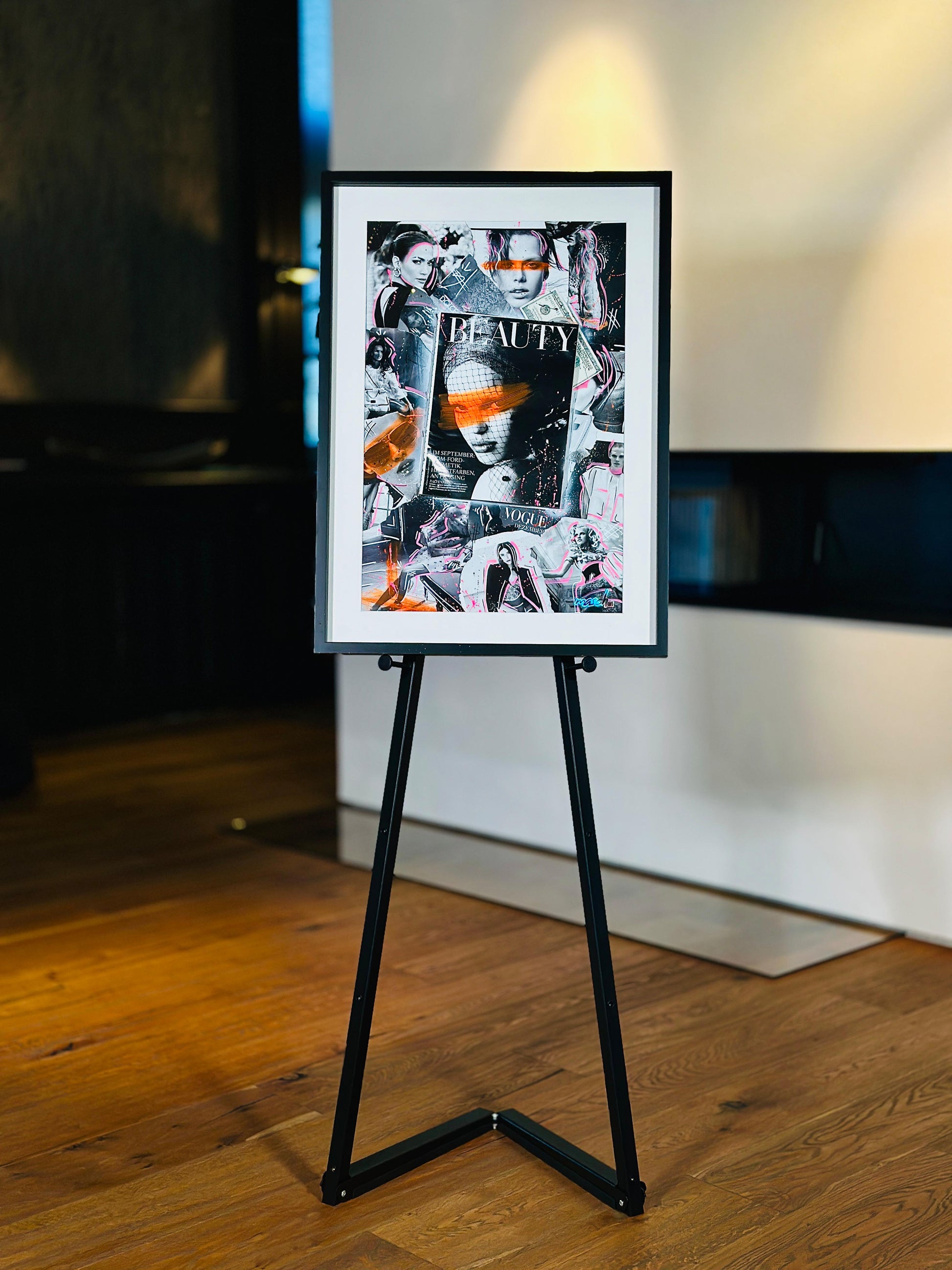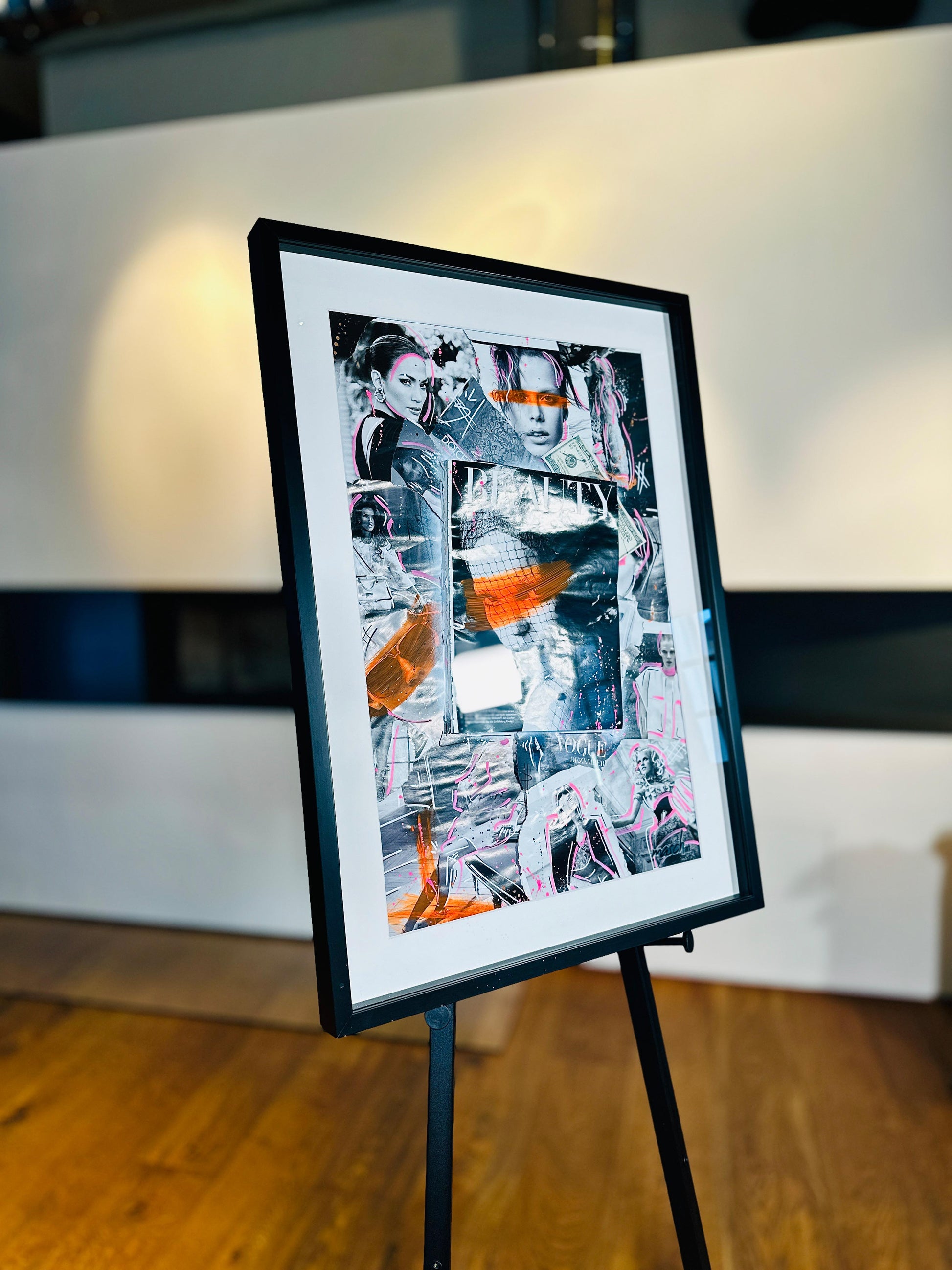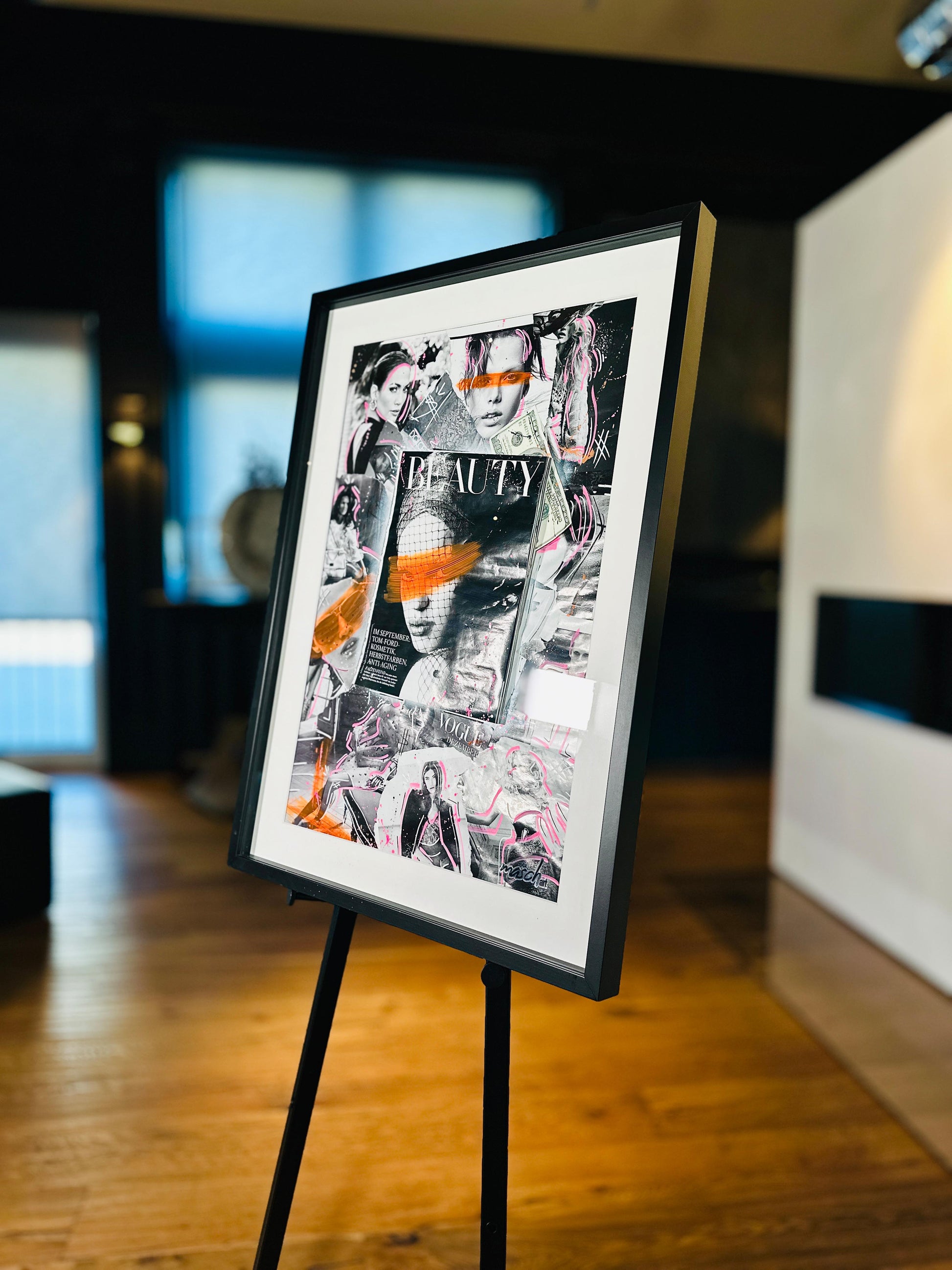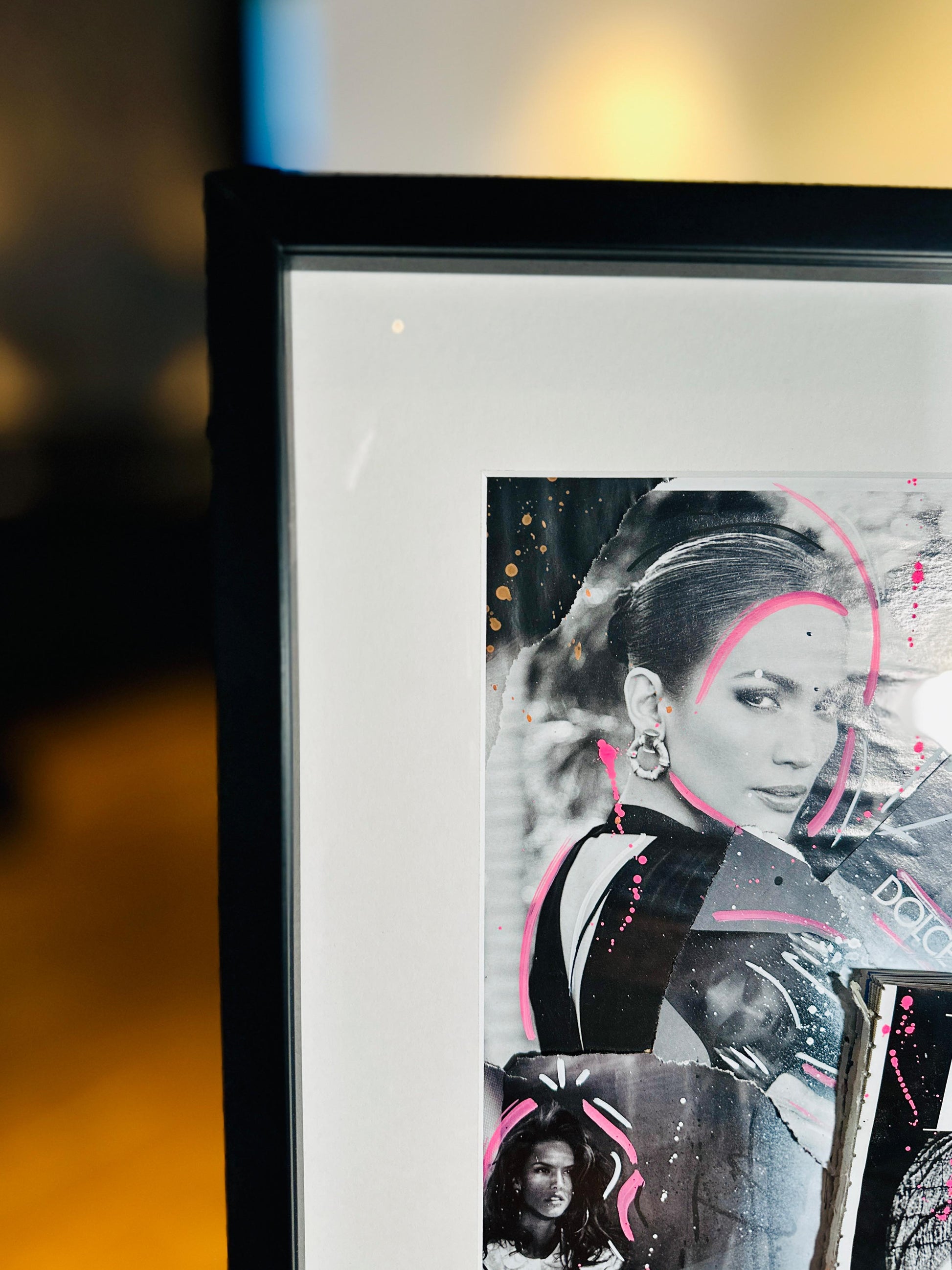 Collage aus Modeikonen, Magazinen und Geld – übermalt mit Neonakzenten. Ein Statement über Schönheitsideale, Glamour und die Illusion von Perfektion.