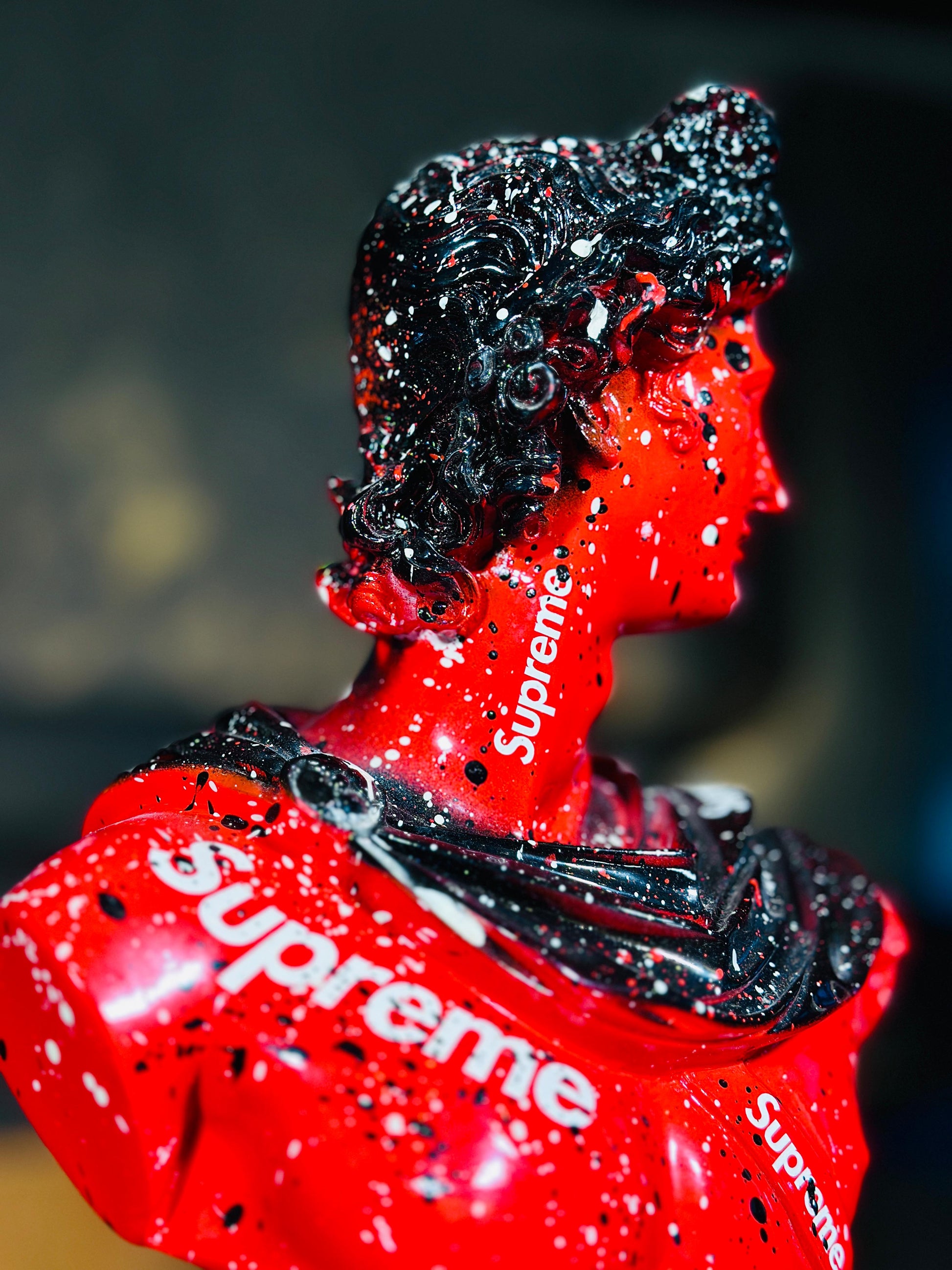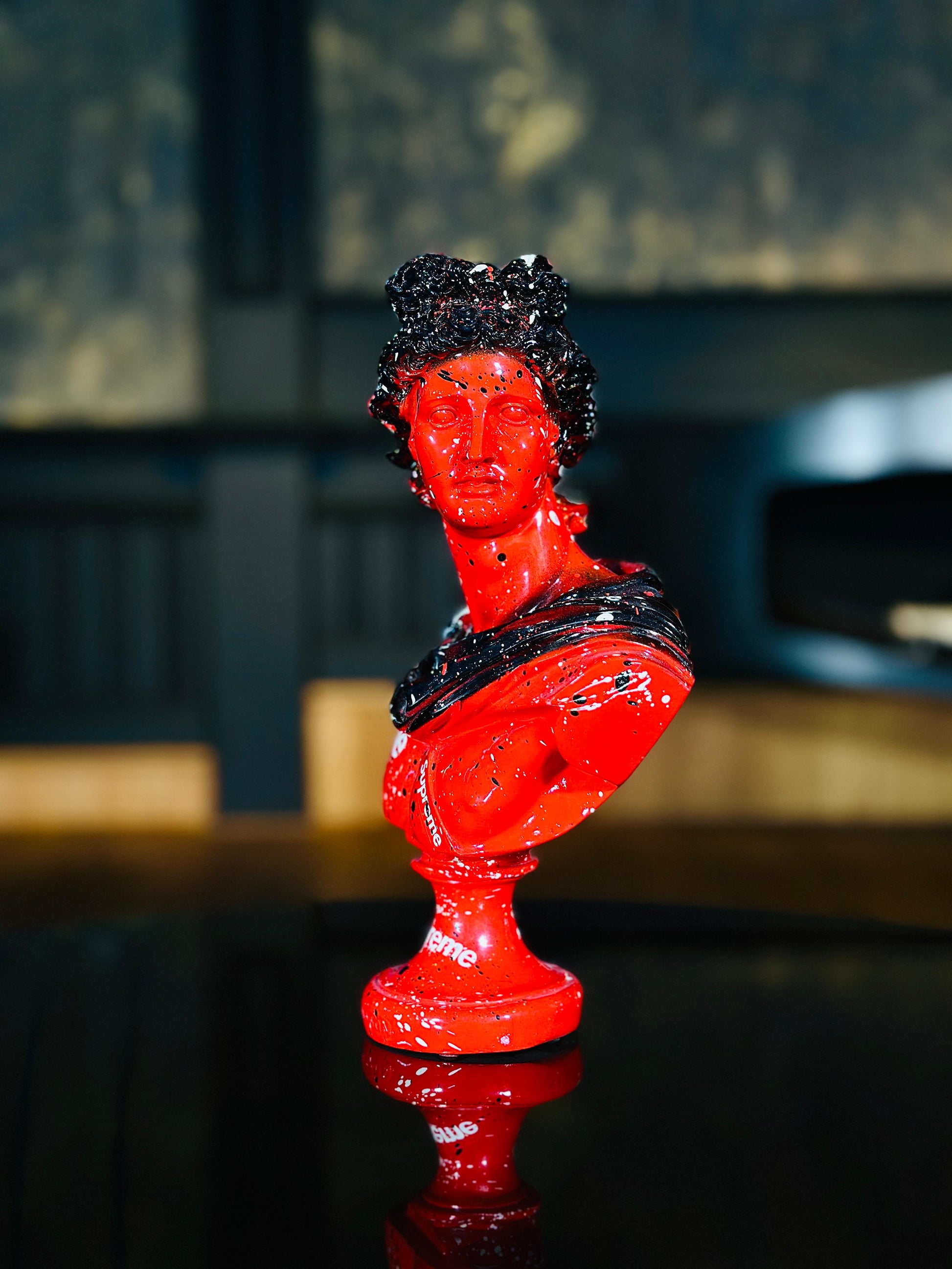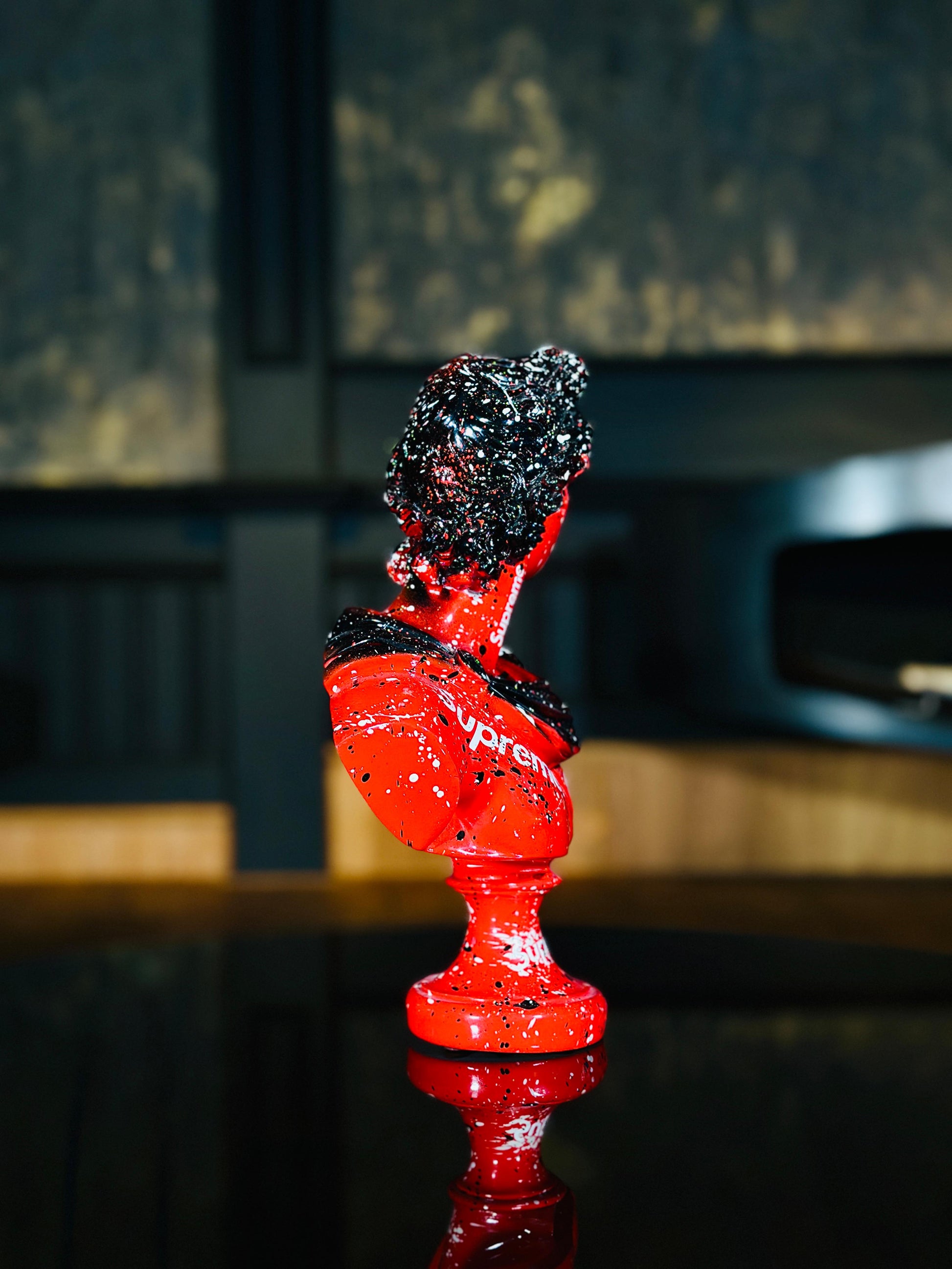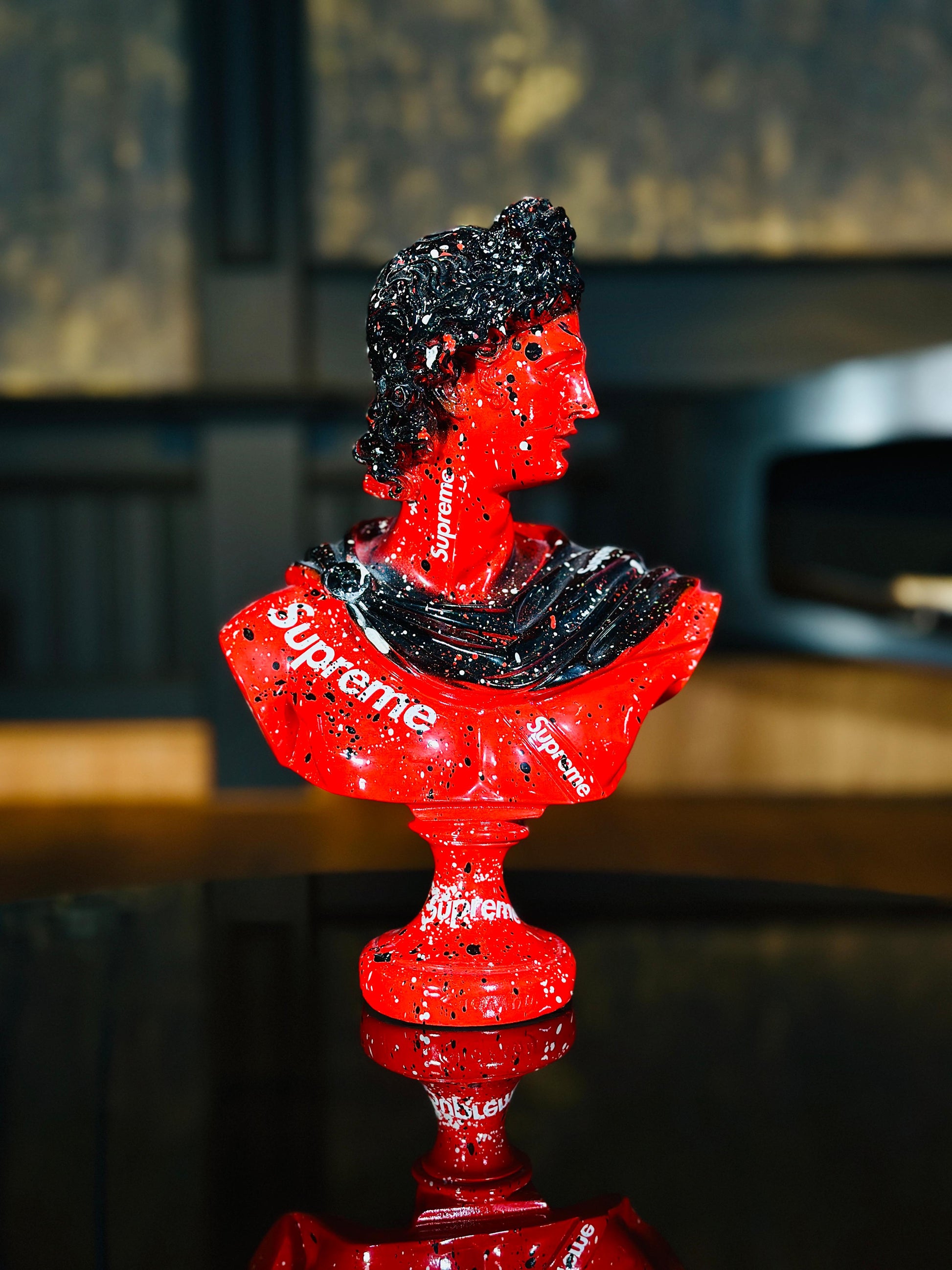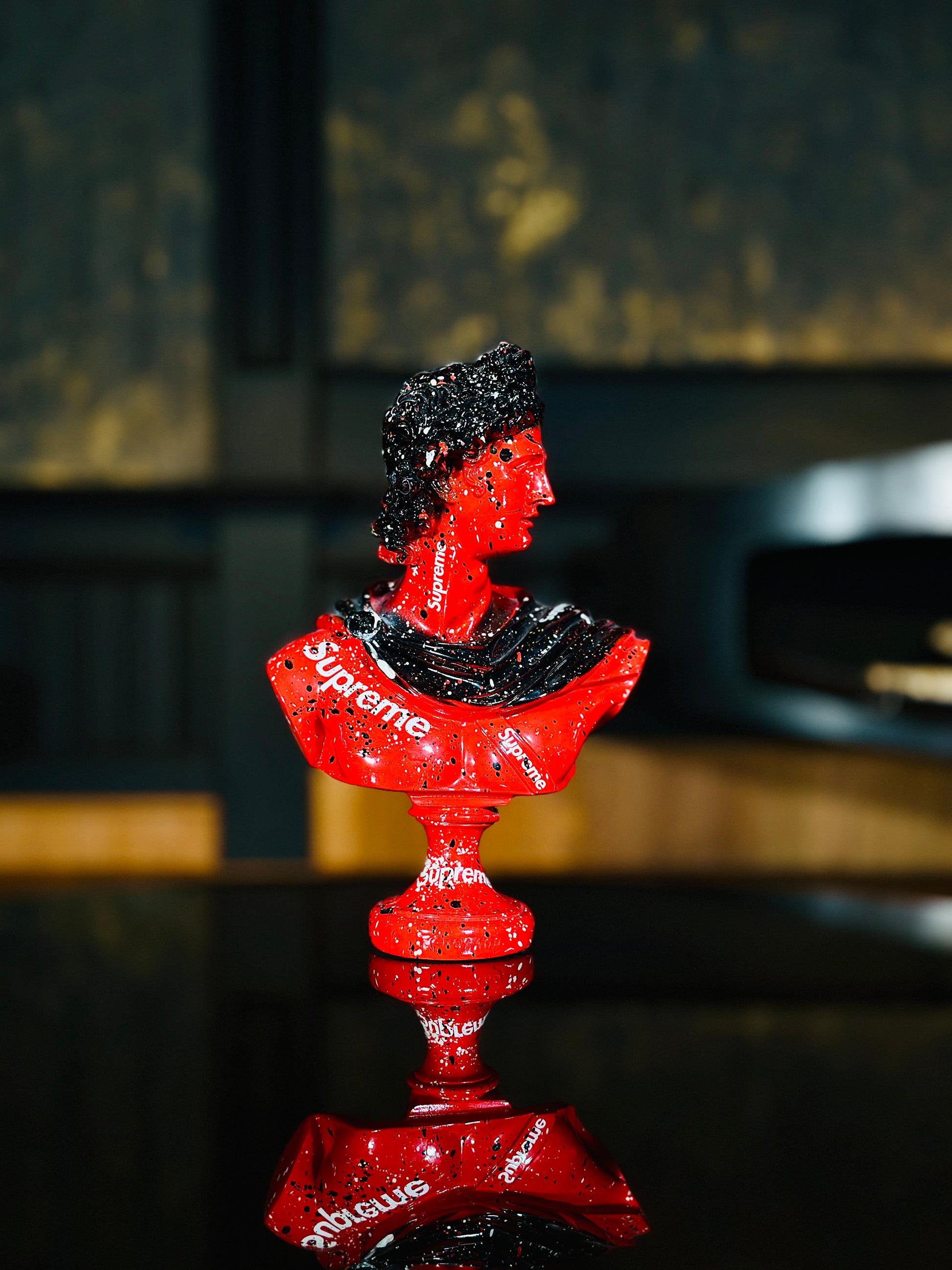 In kräftigem Rot mit kontrastreichen schwarzen Akzenten und dem ikonischen "Supreme"-Branding verschmilzt diese Büste antike Macht mit moderner Streetwear-Kultur. Caesar Supreme ist ein kraftvolles Statement zur Neuinterpretation von Autorität, Stil und Hype – eine Fusion aus Klassik und Urban Art, die provokant und gleichzeitig ikonisch wirkt.