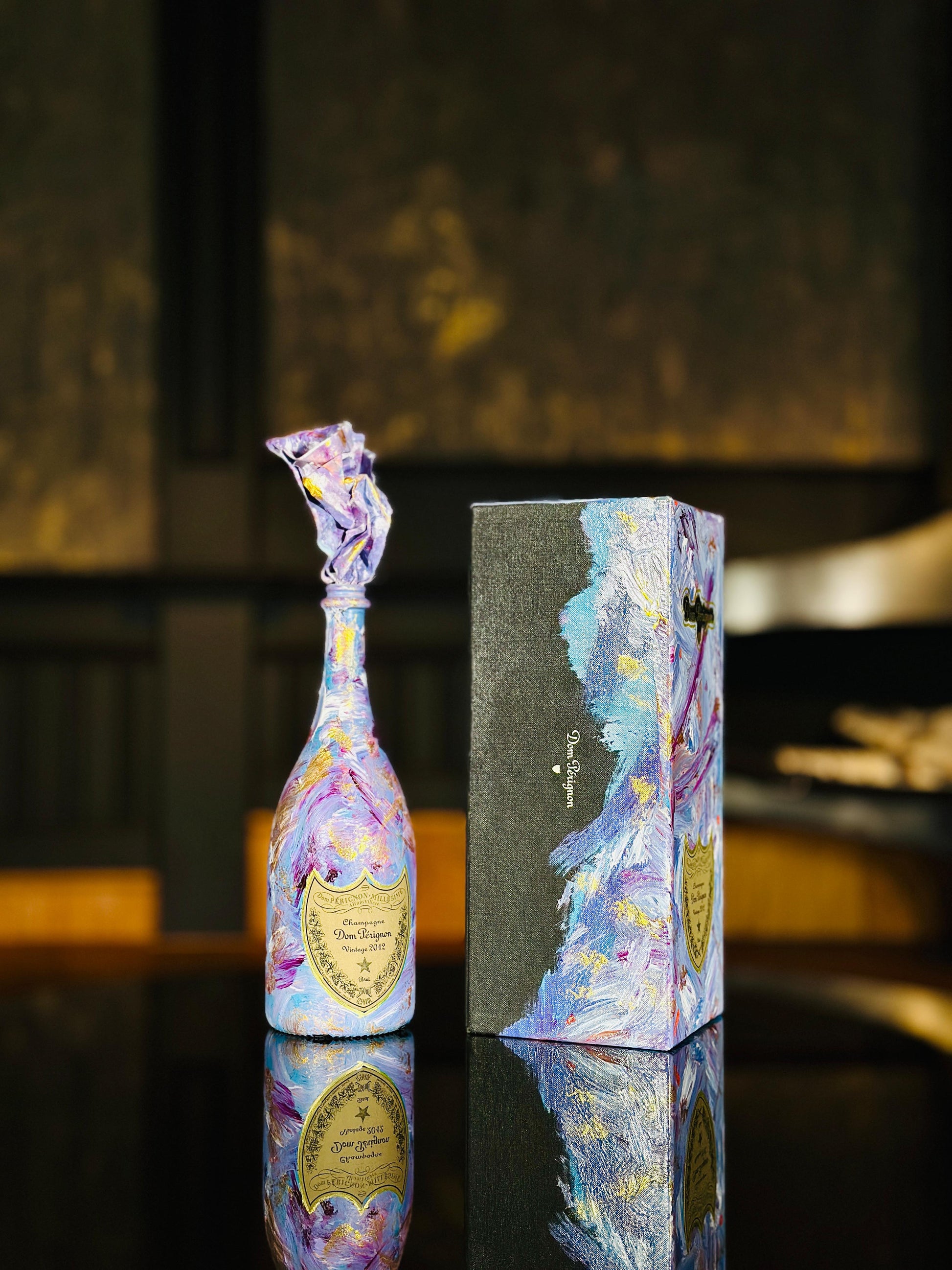 Das Artwork vereint luxuriöse Eleganz mit künstlerischer Freiheit und transformiert das Champagnerobjekt in ein einzigartiges Sammlerstück.