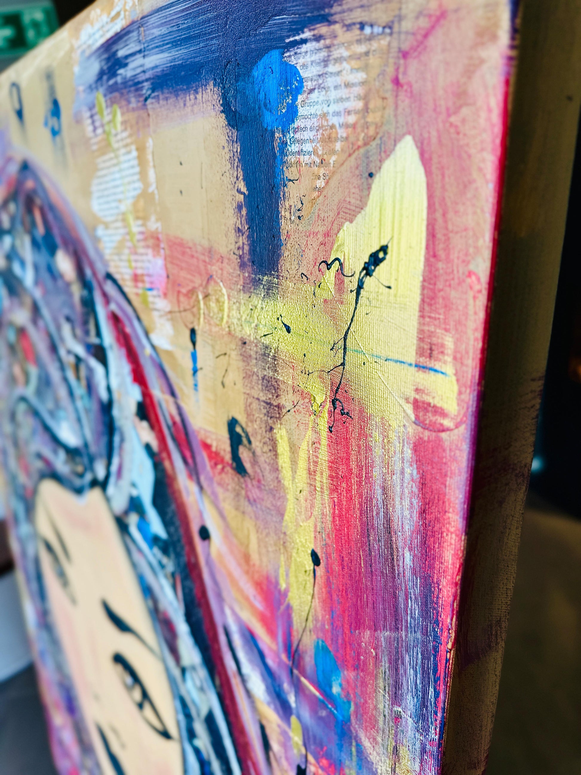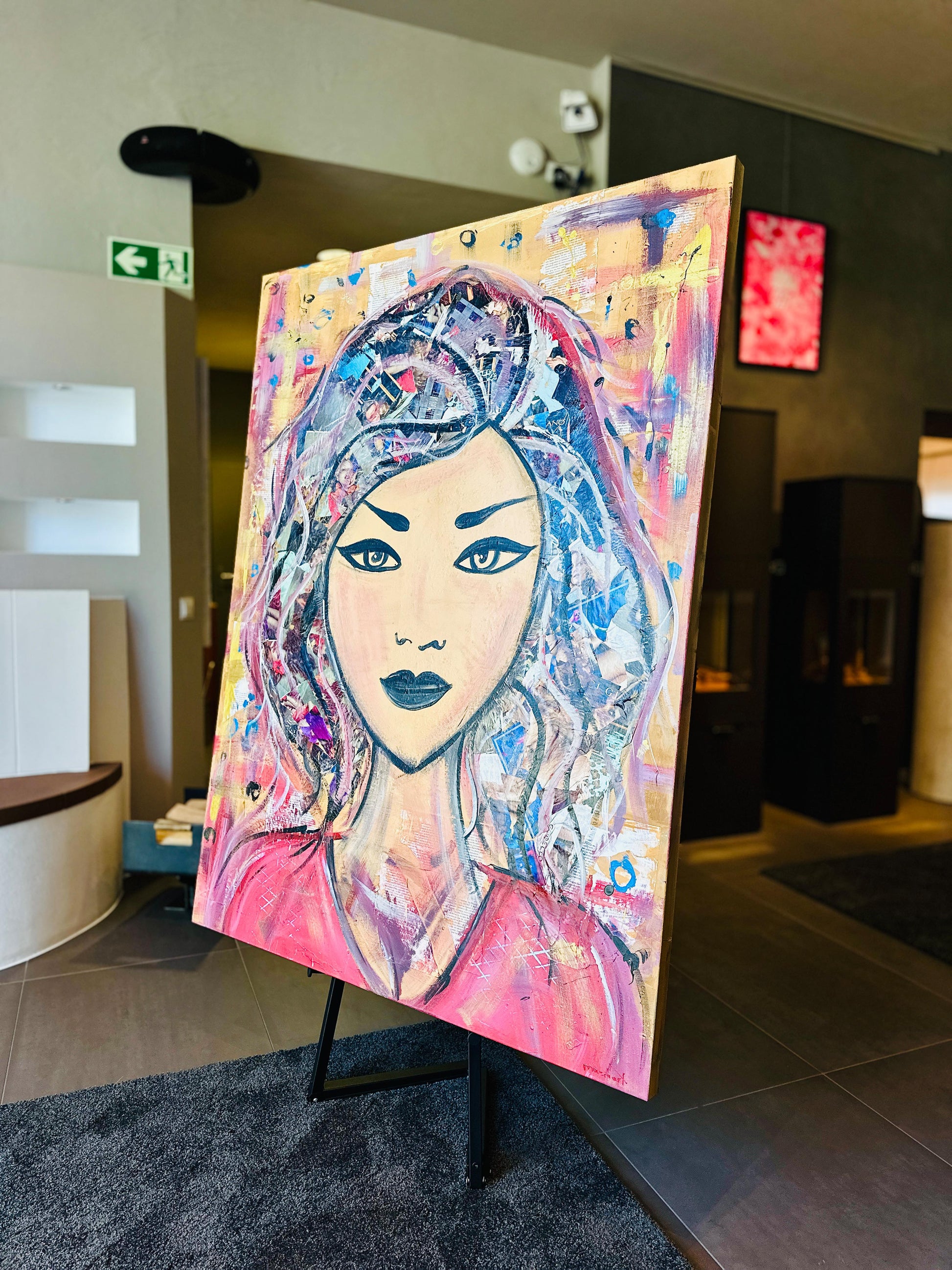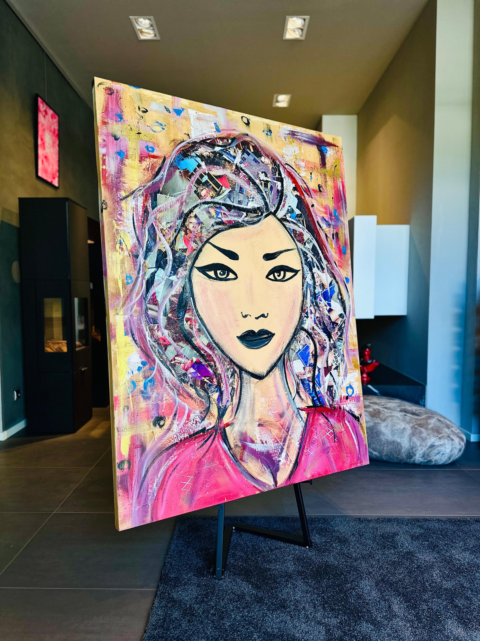Ein kraftvolles Porträt, das Eleganz und Stärke vereint. Mit expressivem Pinselstrich und collagierten Strukturelementen entsteht eine moderne Ikone der Weiblichkeit. Der Blick ist selbstbewusst, die Farbwelt kontrastreich – zwischen zarten Nude-Tönen, tiefem Schwarz und leuchtenden Akzenten. Jedes Detail erzählt von Individualität und innerer Schönheit.