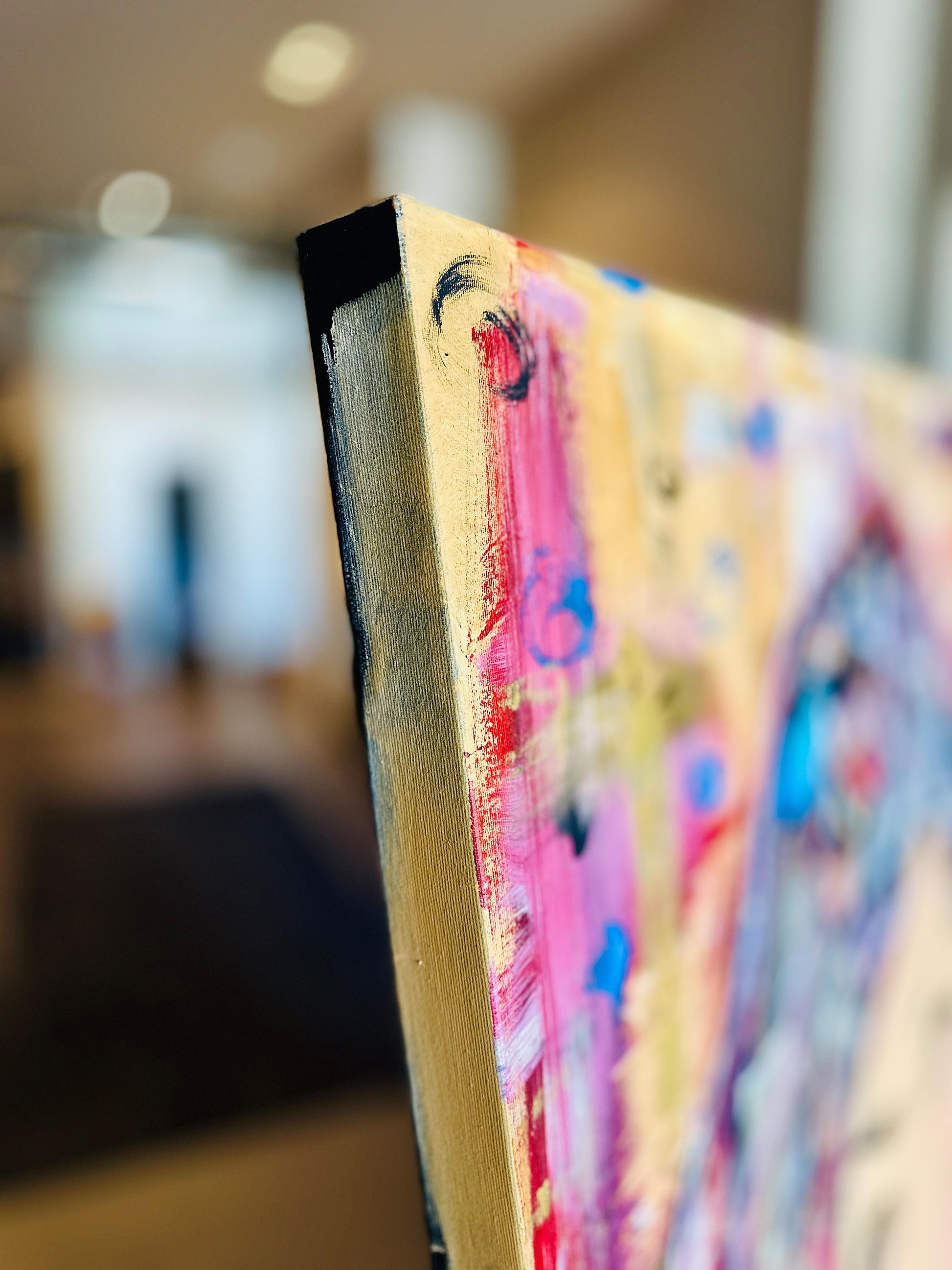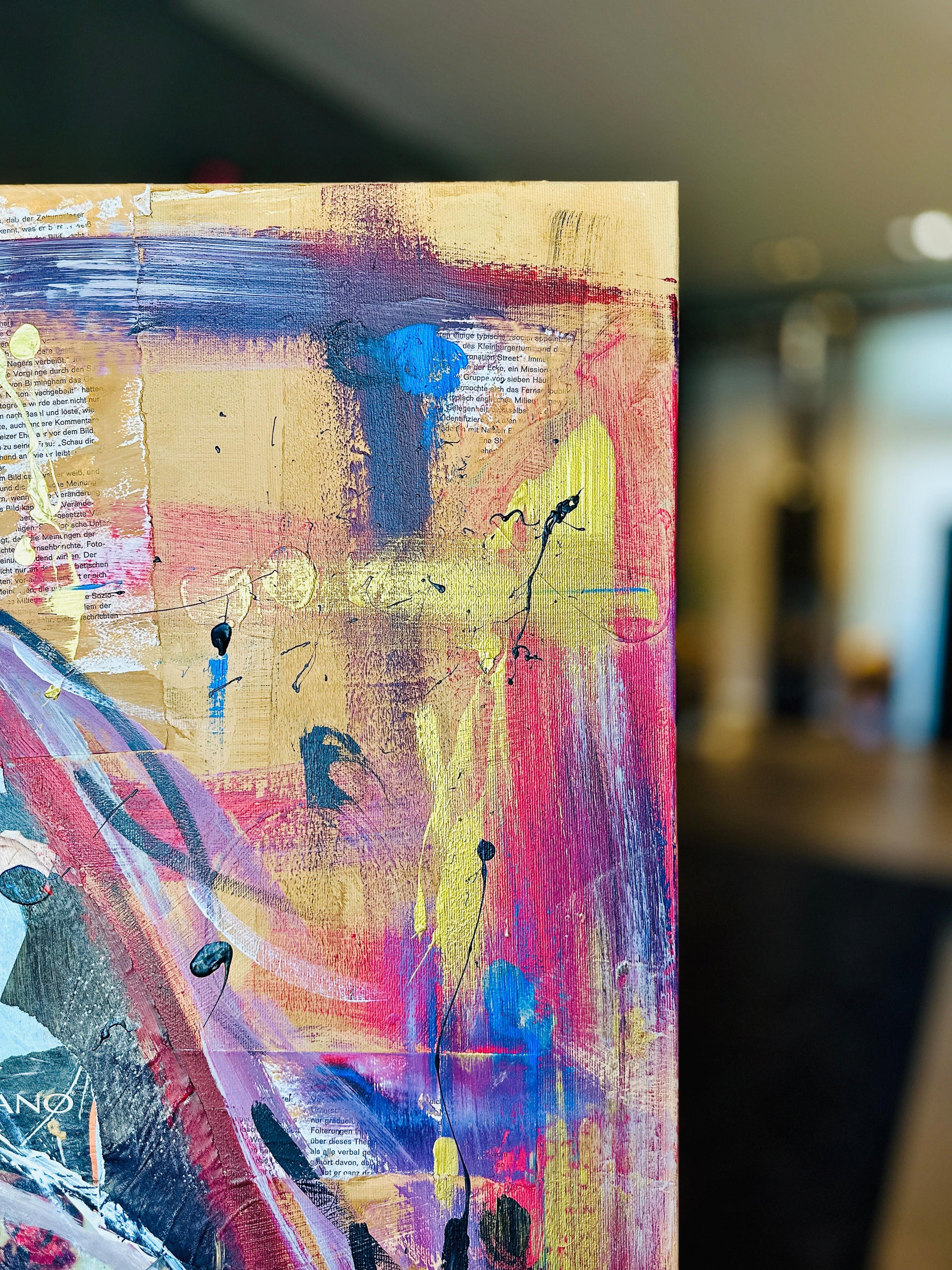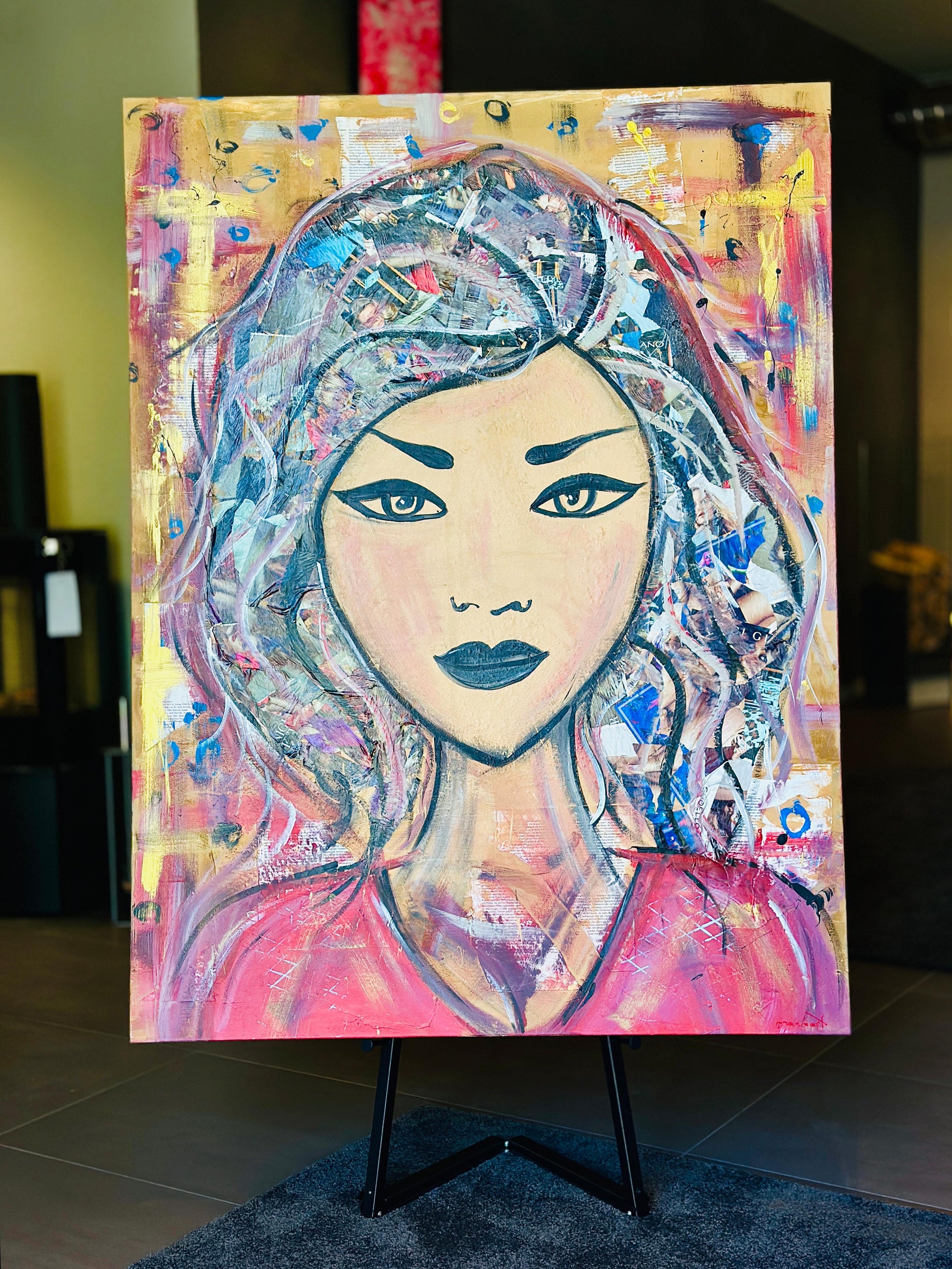 Ein kraftvolles Porträt, das Eleganz und Stärke vereint. Mit expressivem Pinselstrich und collagierten Strukturelementen entsteht eine moderne Ikone der Weiblichkeit. Der Blick ist selbstbewusst, die Farbwelt kontrastreich – zwischen zarten Nude-Tönen, tiefem Schwarz und leuchtenden Akzenten. Jedes Detail erzählt von Individualität und innerer Schönheit.