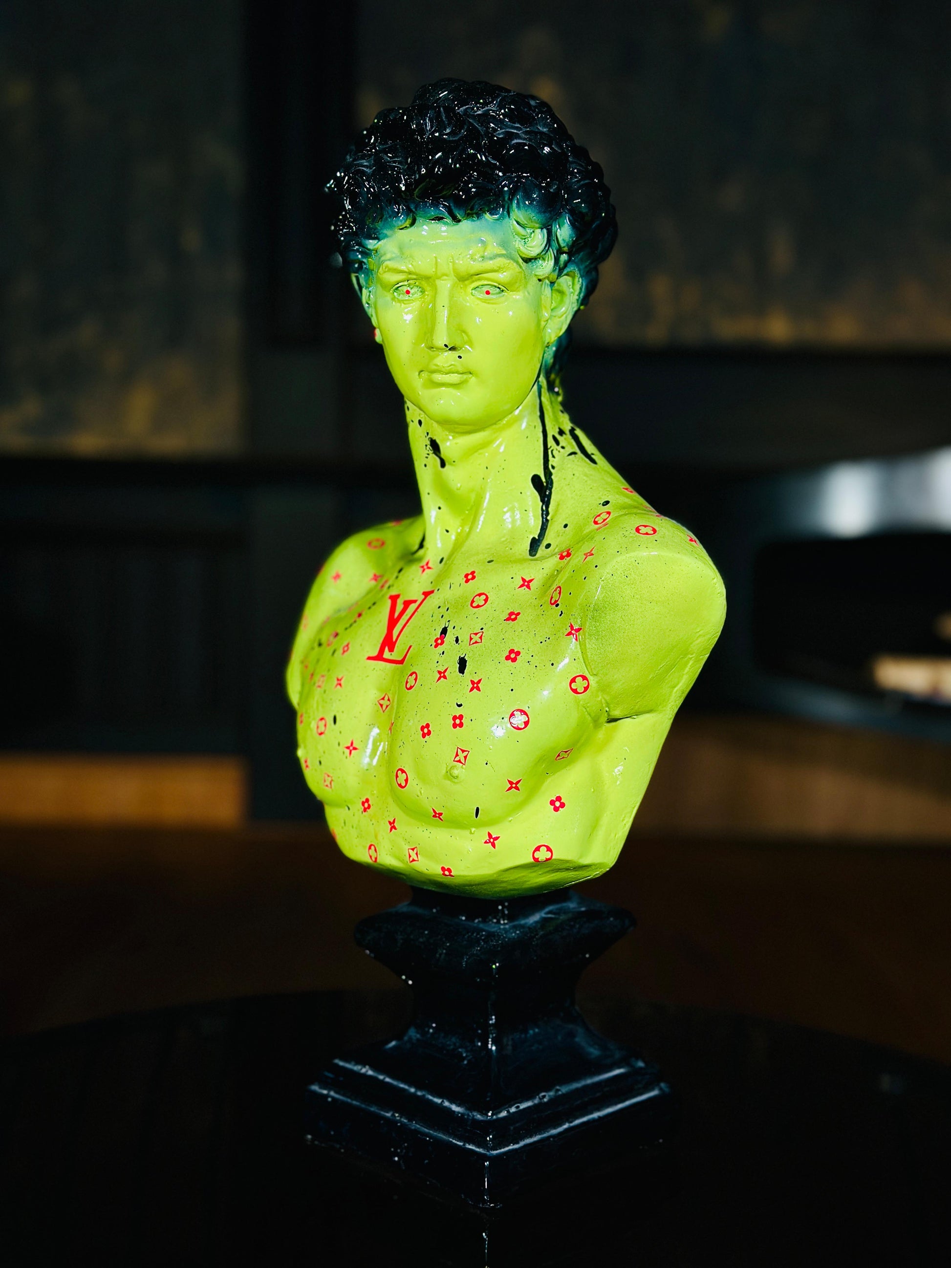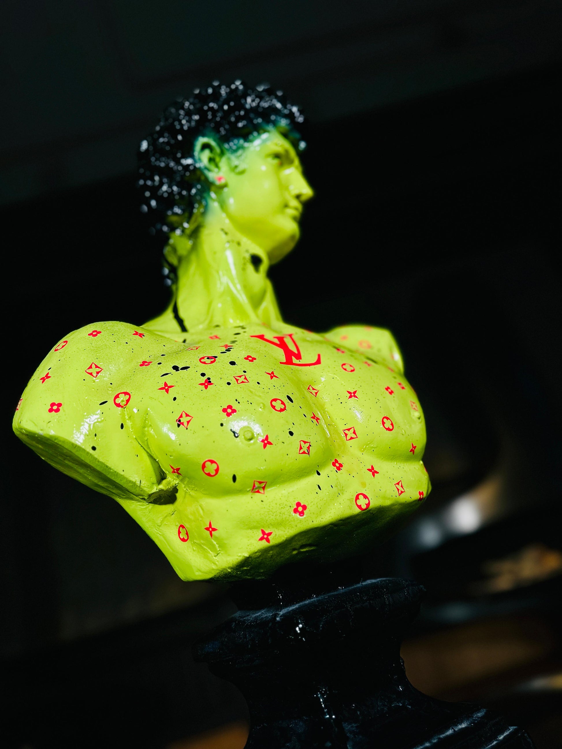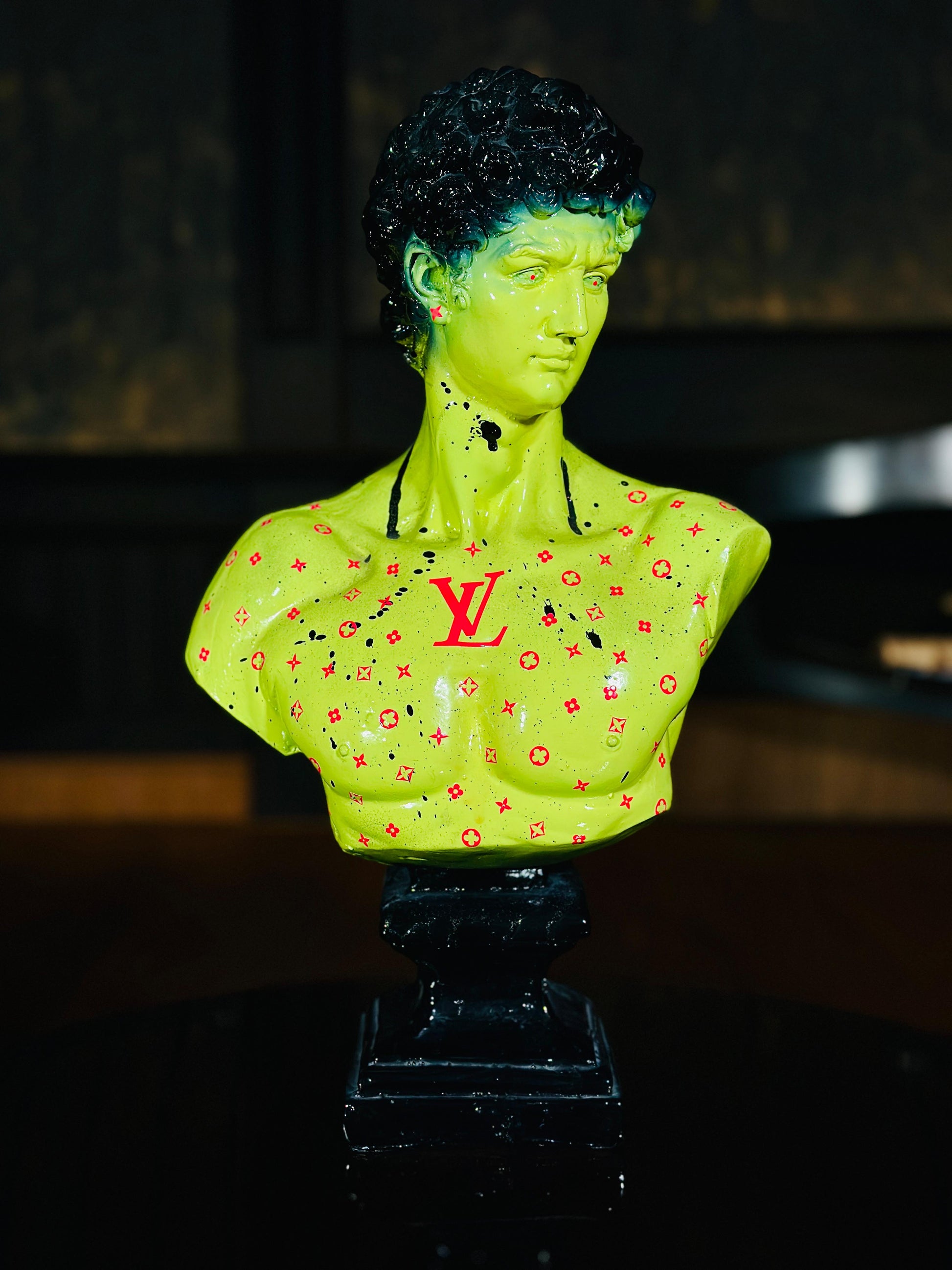 Diese klassisch inspirierte Büste erhält durch ihre neongelbe Lackierung, schwarze Akzente und das ikonisch rote LV-Monogramm ein radikales, modernes Upgrade. Louis David verbindet antike Formen mit zeitgenössischem Luxusbranding und Street-Art-Ästhetik – ein augenzwinkernder Kommentar zur Verschmelzung von Hochkultur und Konsumkultur.