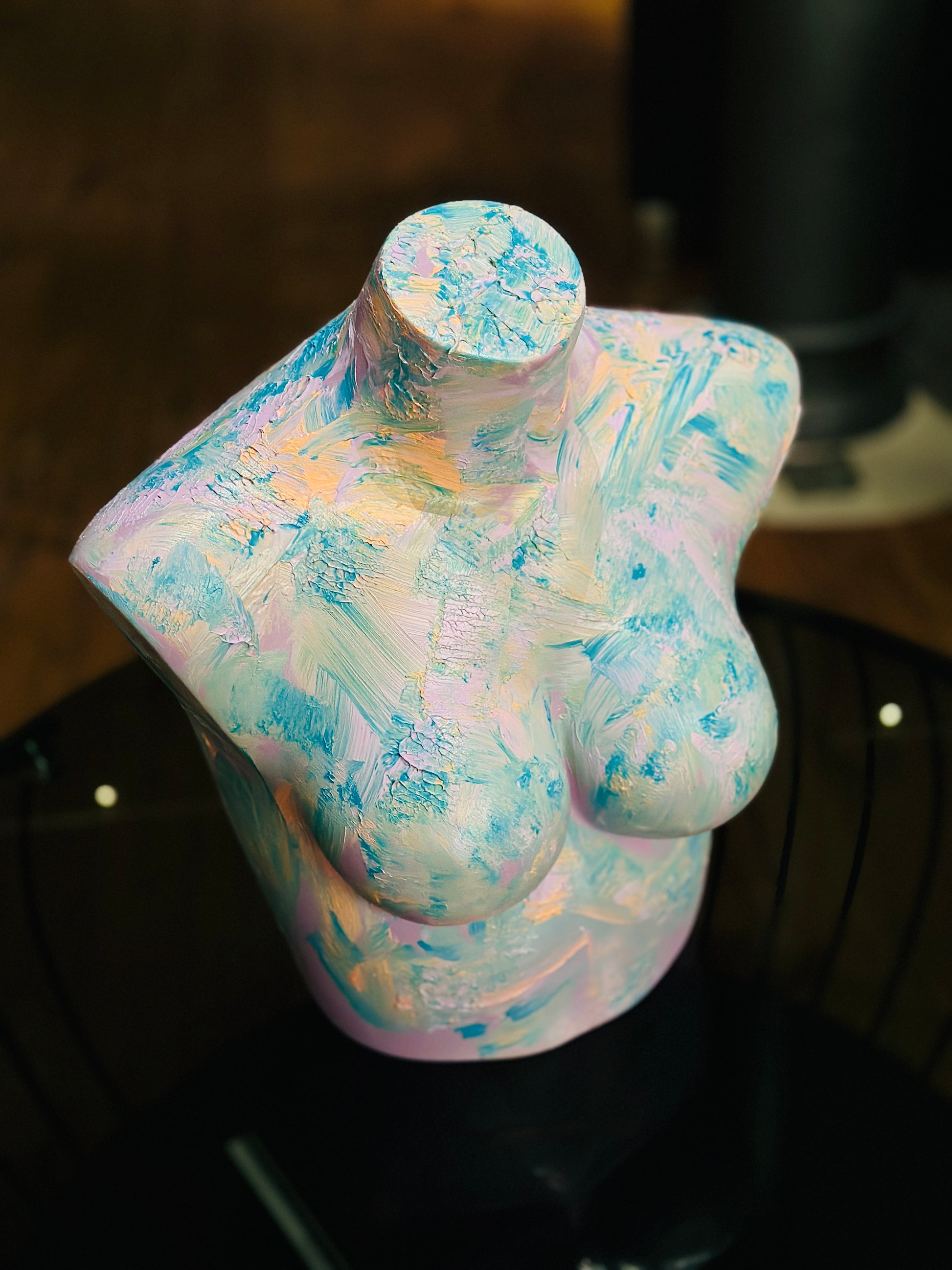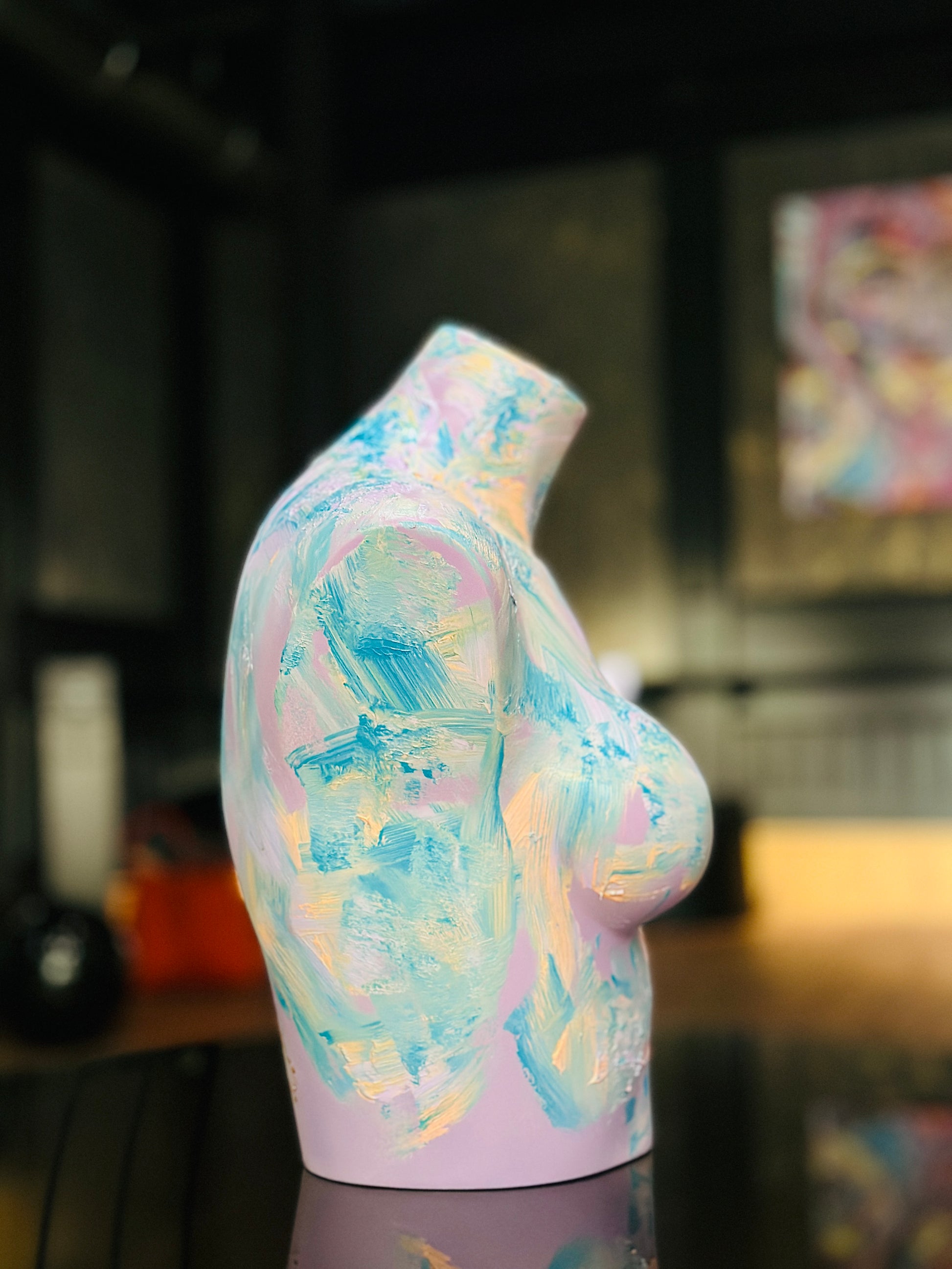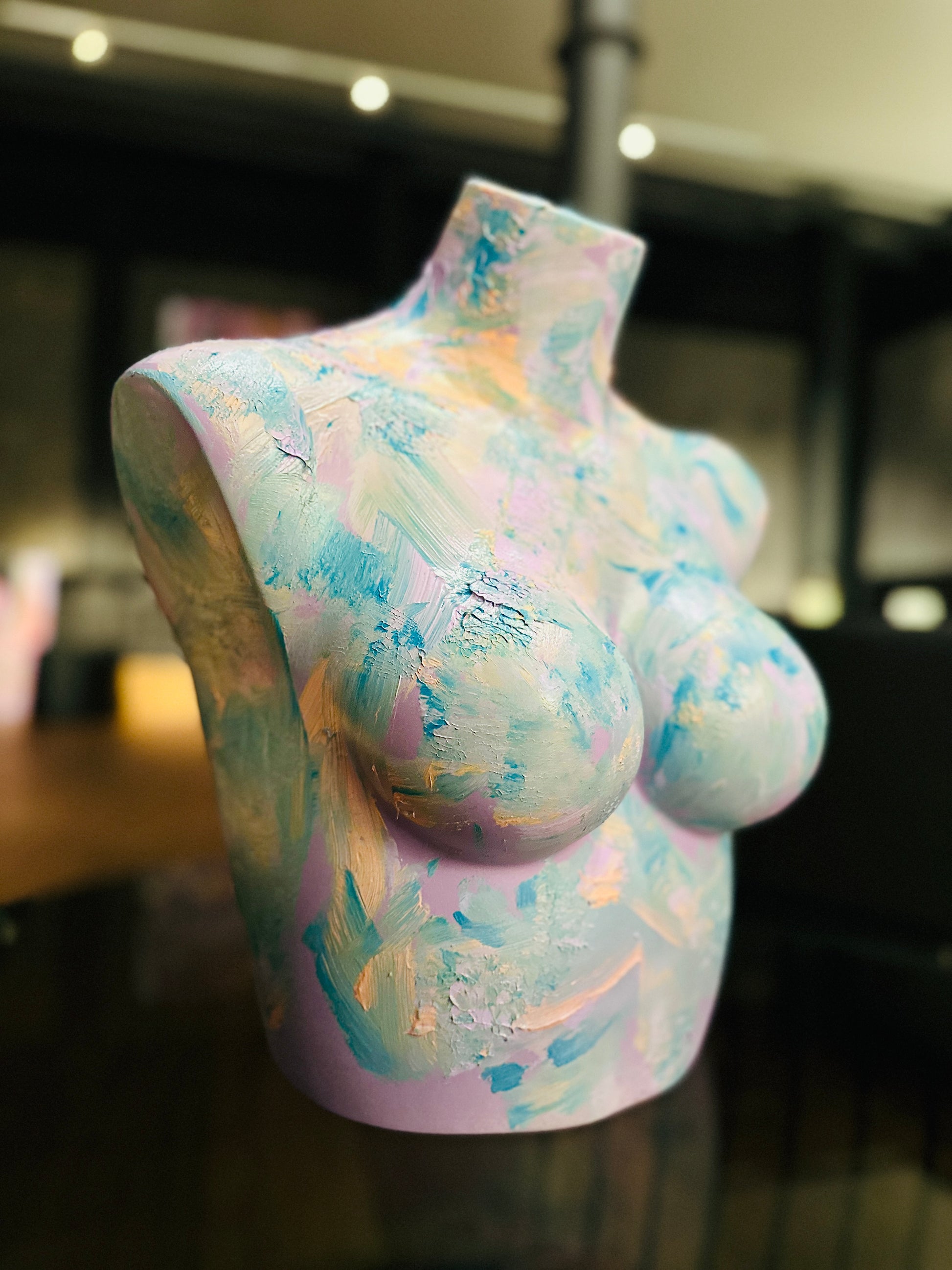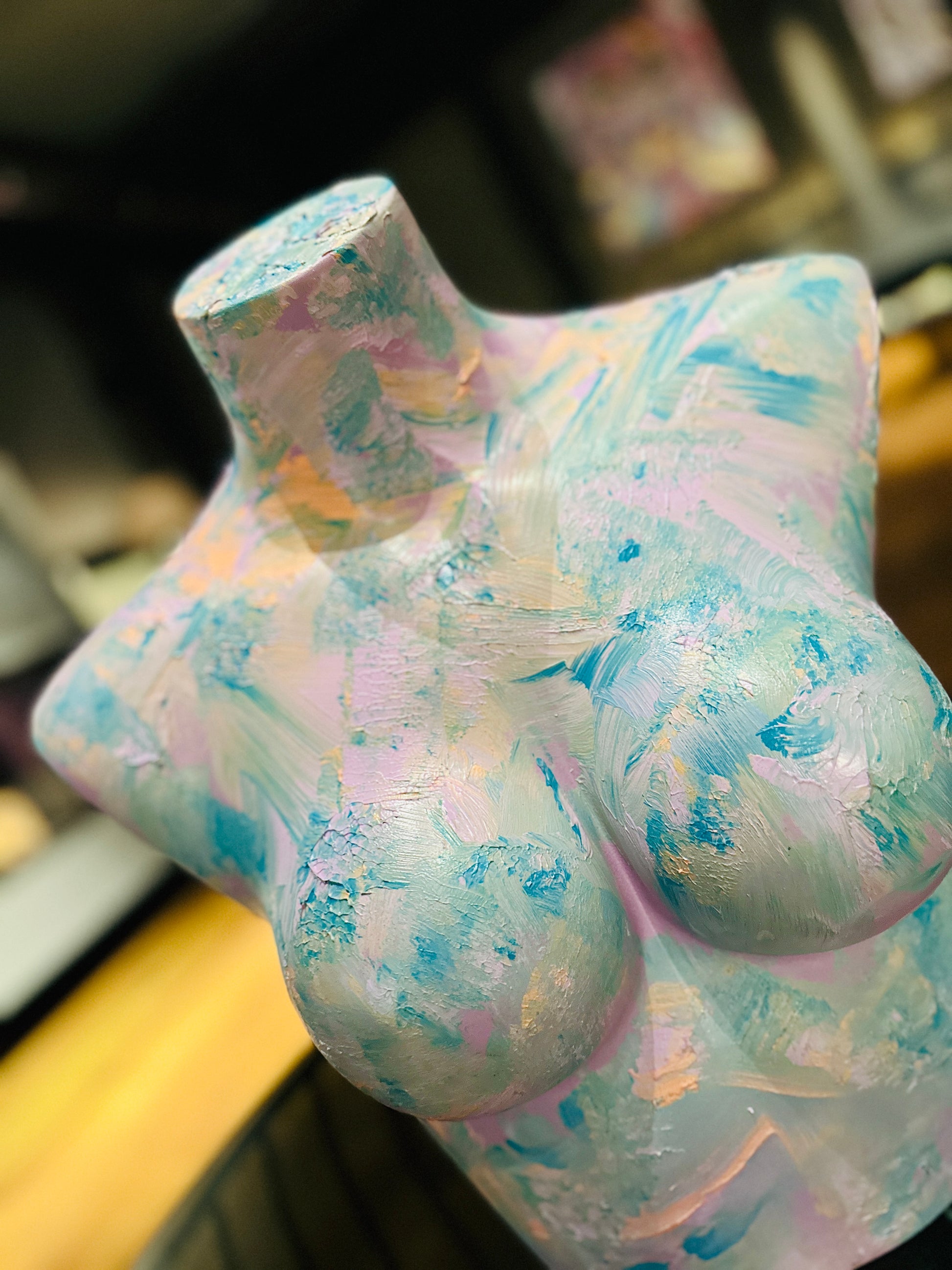 Wie ein Pastellfarbener Traum. Sanft, verspielt und doch voller Leben - Diese Skulptur feiert das zarte in uns. Texturierte Torso Skulptur.