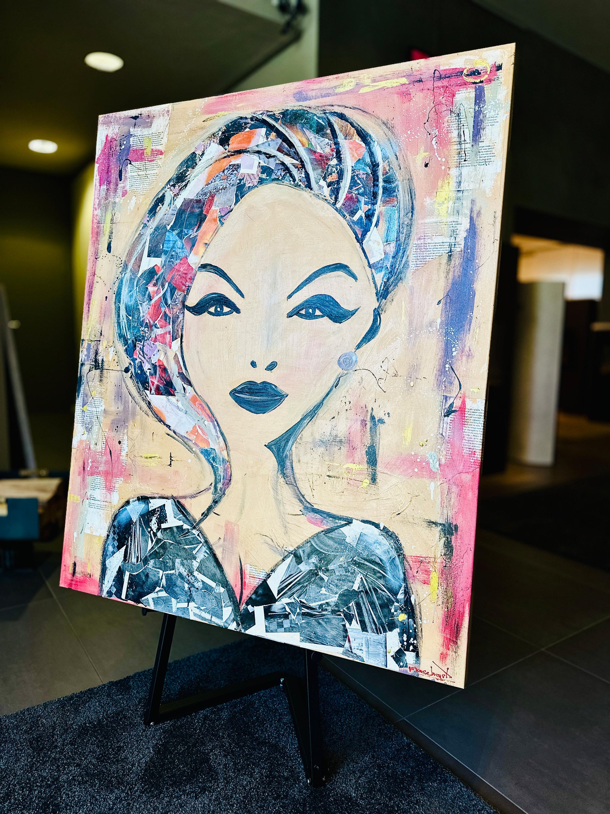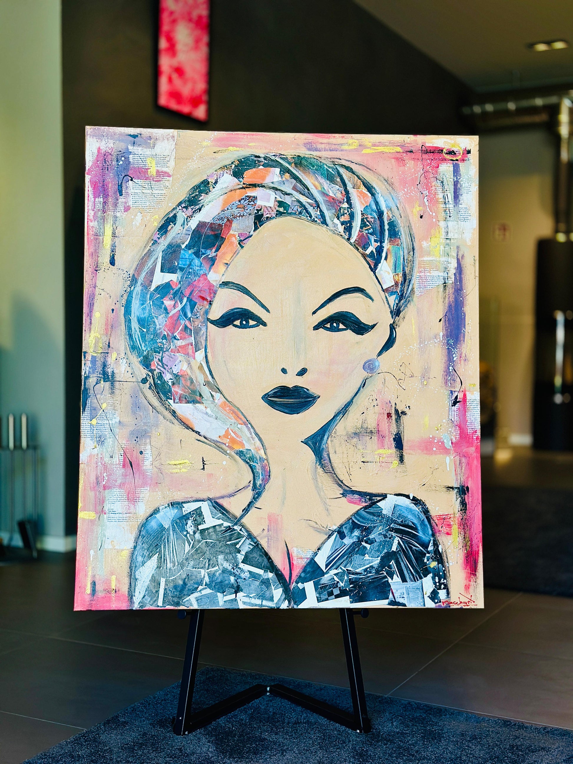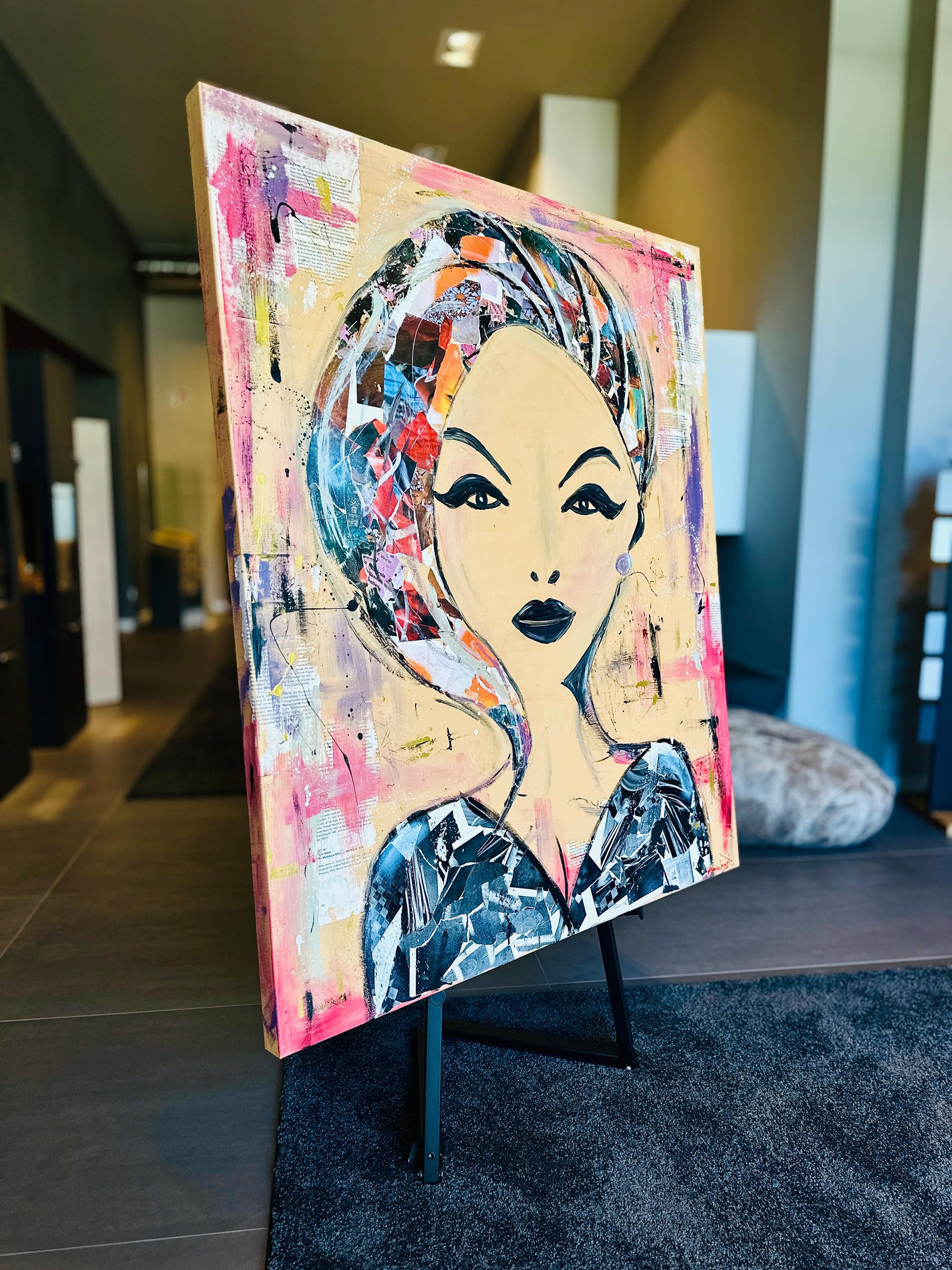 Dieses eindrucksvolle Kunstwerk vereint kraftvolle Linien mit einer dynamischen Farbkomposition. Die weibliche Figur strahlt Selbstbewusstsein, Stil und zeitlose Schönheit aus.