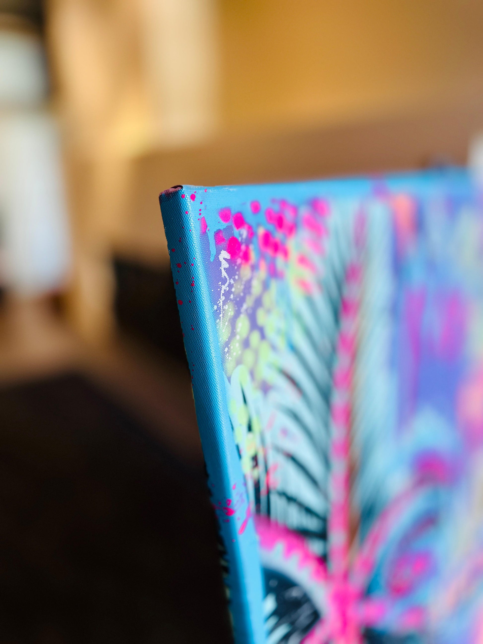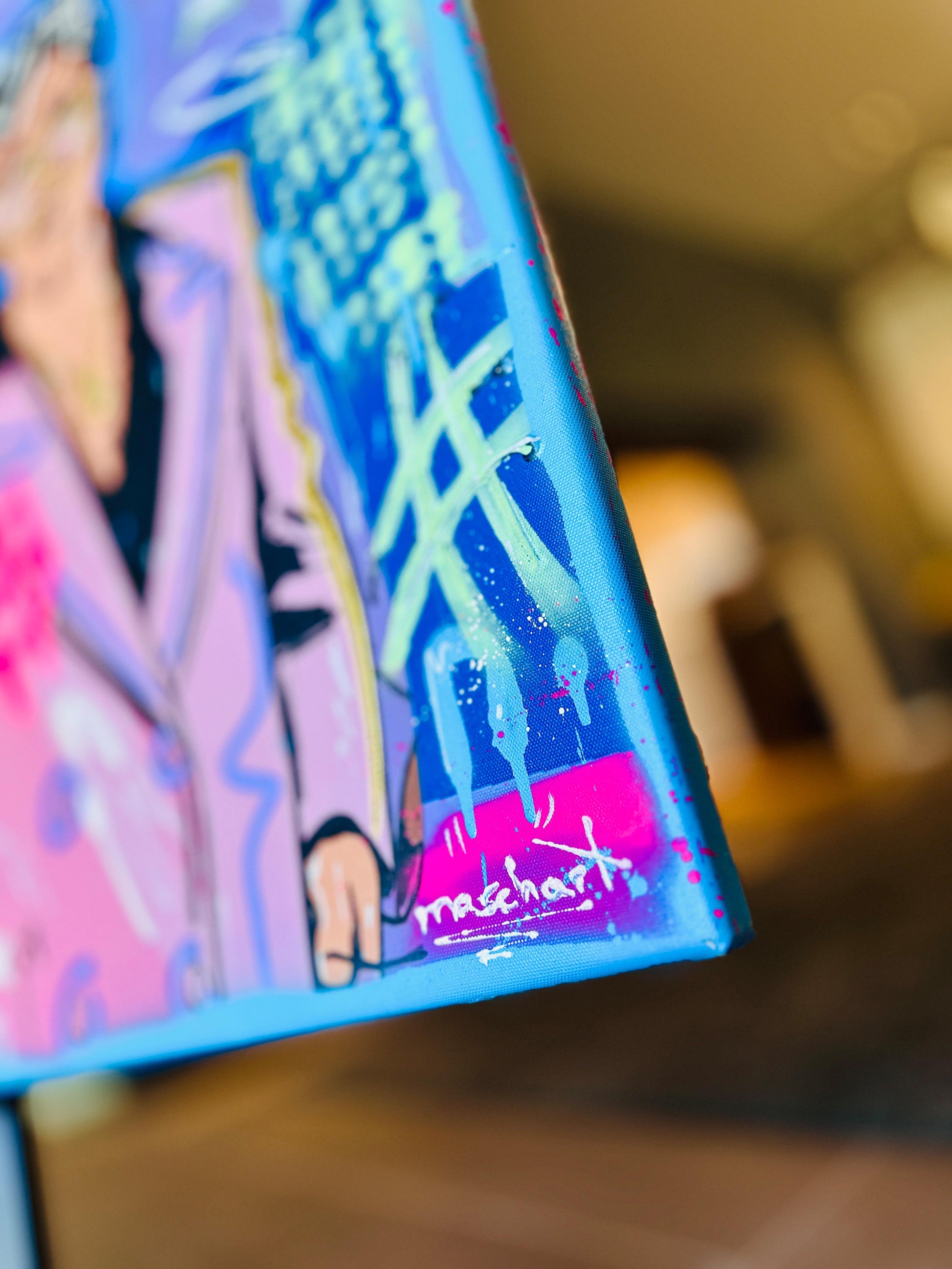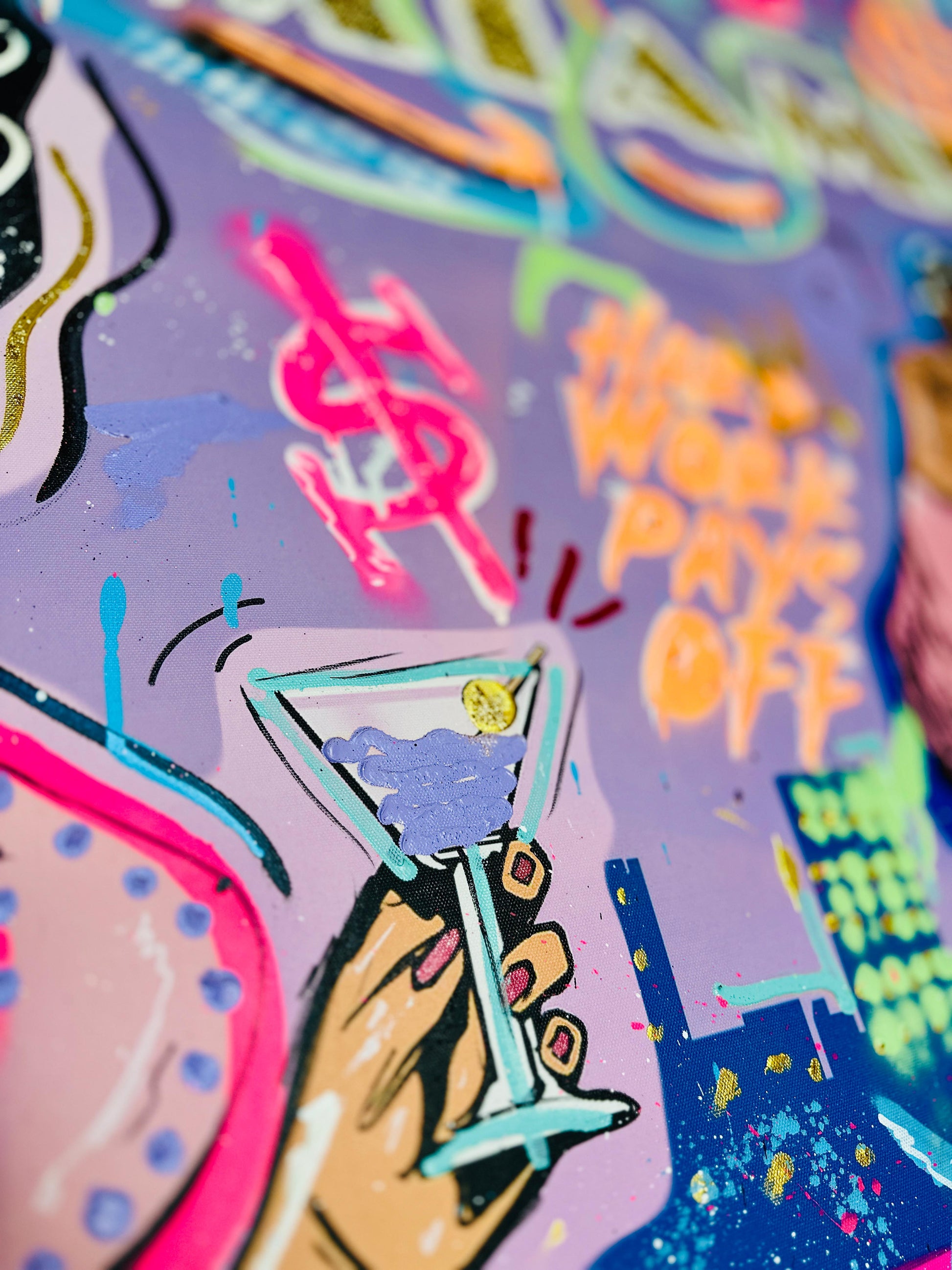 Dieses farbgewaltige Pop-Art-Werk entführt in das vibrierende Nachtleben Miamis – eine Welt aus Palmen, Luxus, Verlockung und Erfolg. Neonfarben, Dollarzeichen und der Schriftzug „Hard Work Pays Off“ unterstreichen das zentrale Thema: Reichtum, Glamour und der Preis des Erfolgs.